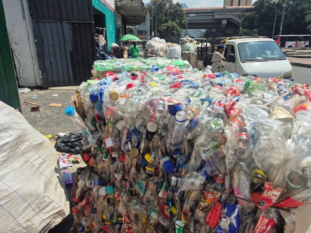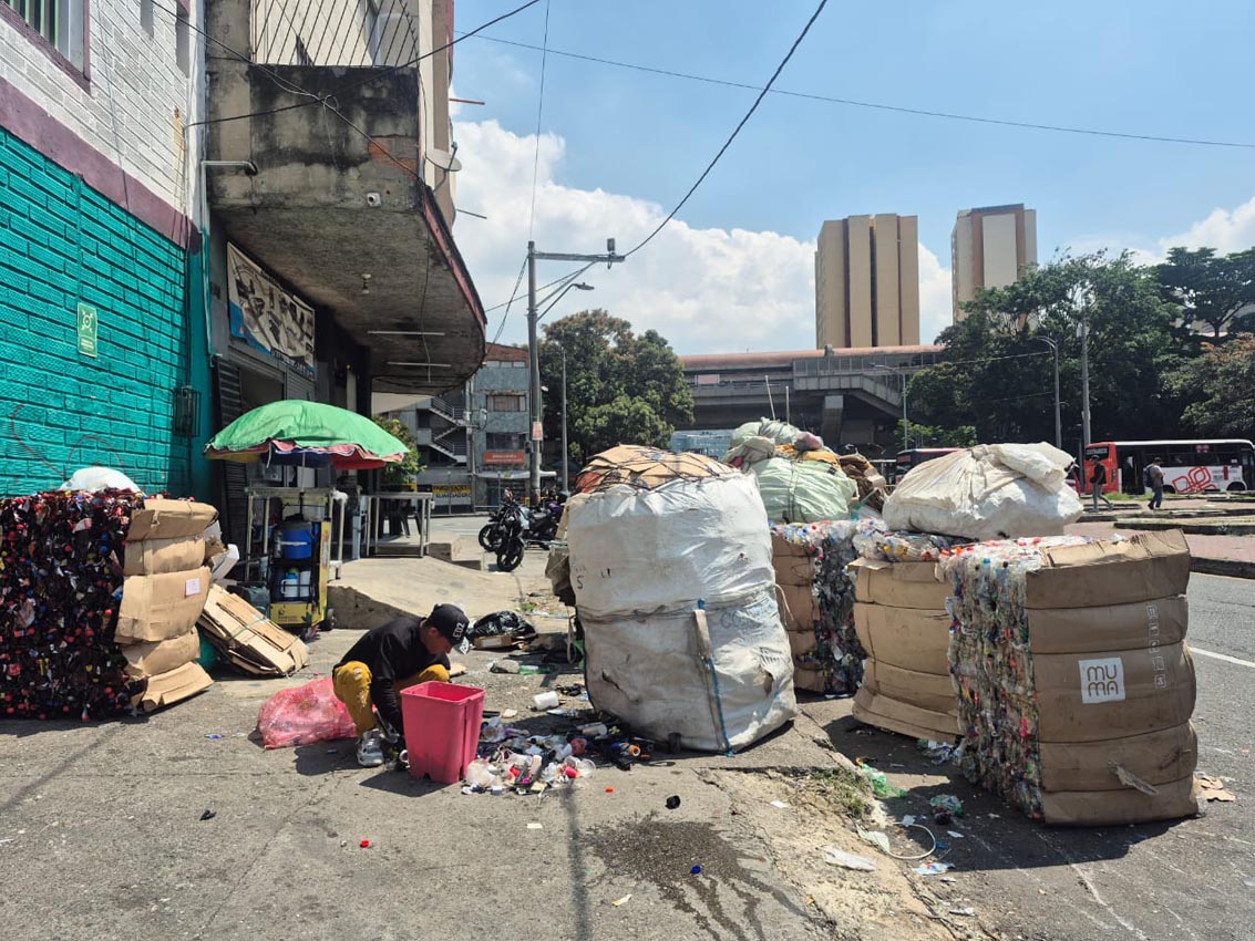 Transcurre una mañana de miércoles de sol radiante en Medellín. El camión está parqueado en las afueras del acopio de la cooperativa Recimed, ubicado en el barrio Jesús Nazareno de la comuna 10 (La Candelaria, Centro), cerca de la estación Prado del metro. Ya tiene más de 10 pacas acomodadas y en un rato saldrá desde esta sede, propiedad de la Alcaldía que usa Recimed en comodato.