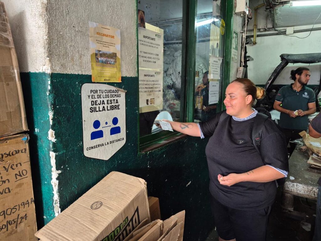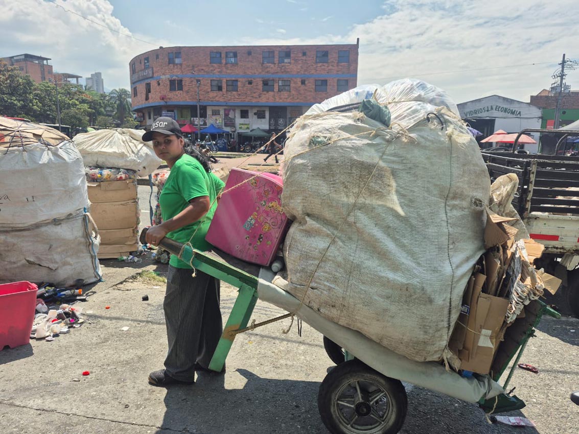 Esta mañana varios de ellos están trabajando en la bodega de Recimed. Caminan entre costalados de plástico, cartón, papel, vidrio… Una colega que acaba de llegar con el material que recogió en su labor espera afuera, en el andén, con su carretilla verde.