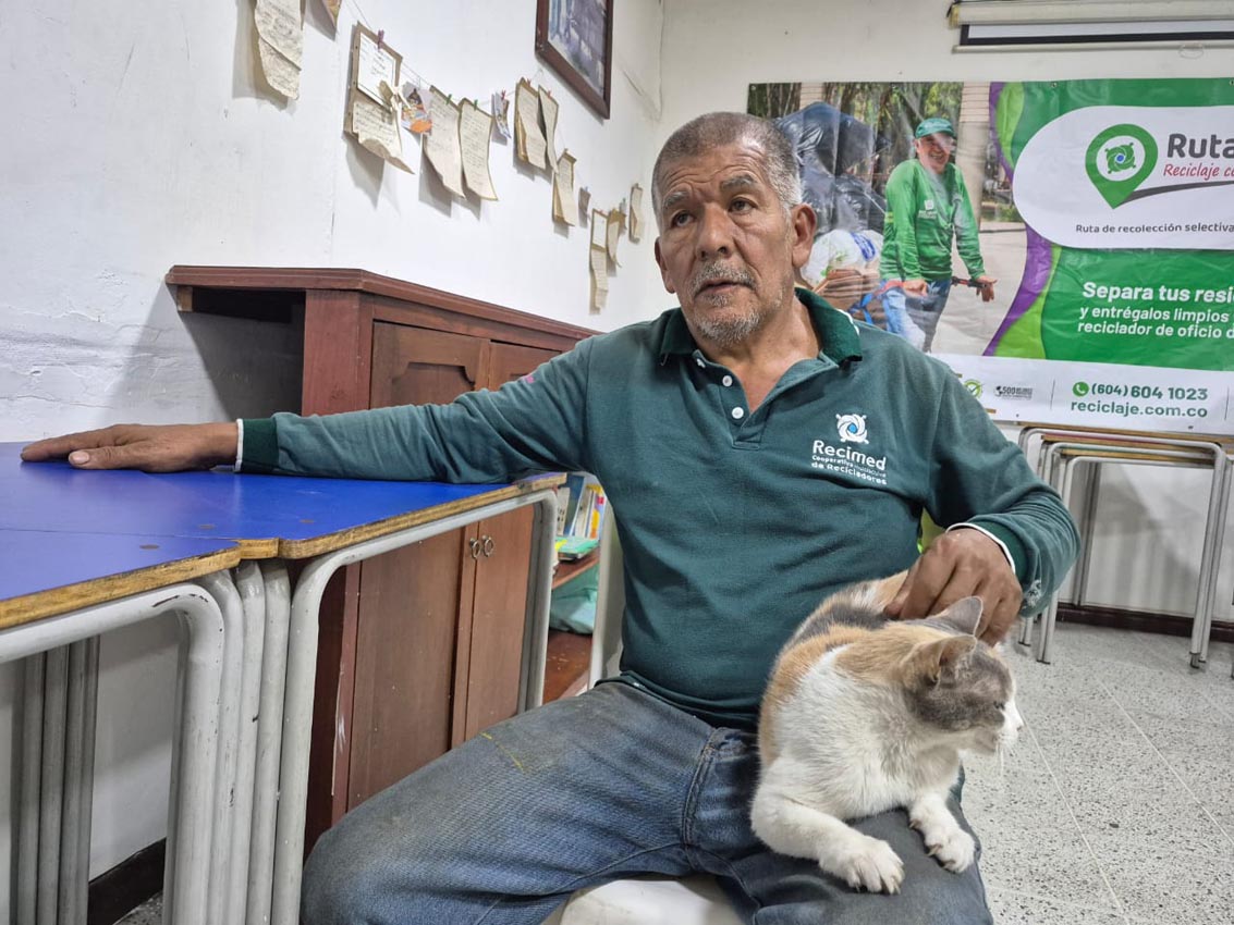 Jorge Arturo Rivera, reciclador y socio de Recimed, con Mía, la mascota que adoptaron en la cooperativa