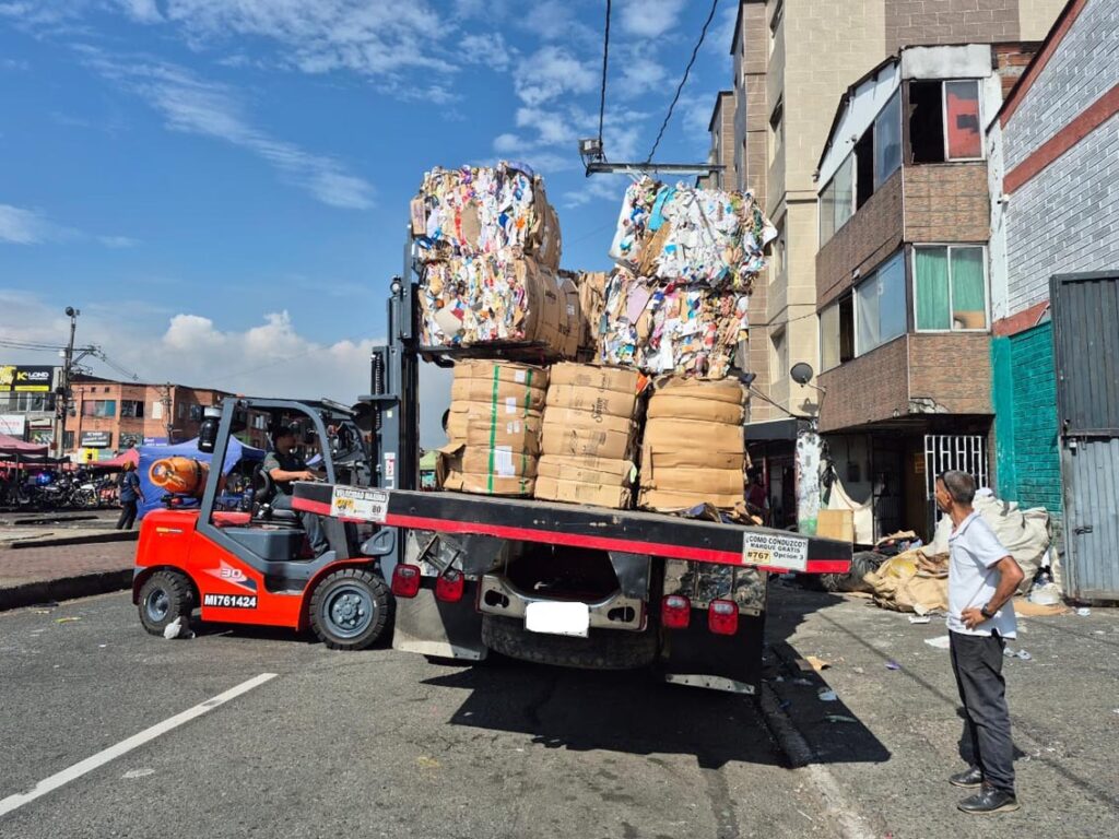 El montacargas elevó sus brazos y puso en el camión dos pacas de plegadiza (cartón delgado, utilizado para cajas de medicamentos, cosméticos y alimentos), cada una de 500 kilos. Meses atrás, cuando no estaba este vehículo, los recicladores movían las pacas en una carreta dentro de la bodega y, para llevarlas al carro que las transporta hasta la empresa compradora, buscaban a un montacarguista con su respectiva máquina para que apoyara la tarea.