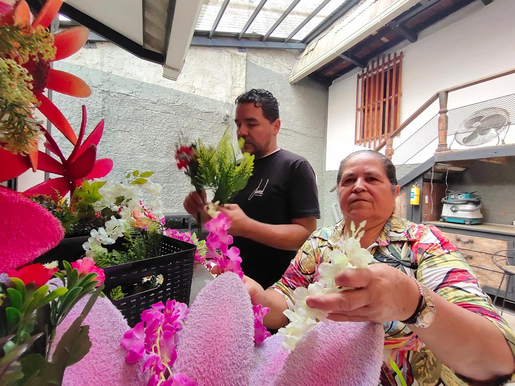 La artesana, Silvia Taborda, una de las encargadas de decorar las estructuras dijo que “a las flores les hacemos su respectivo corte, las echamos en recipientes con agua y anilina para conservar el color y darles un color más agradable, dependiendo de lo que necesiten los clientes que las vayan a llevar. Después de tenerlas con estos procesos, las llevamos a un elemento que se llama oasis, que viene humedecido, y las instalamos allí, donde permanecen varios días frescas. Sin embargo, se les hace mantenimiento constantemente, o día de por medio, para que se conserven mucho mejor”.