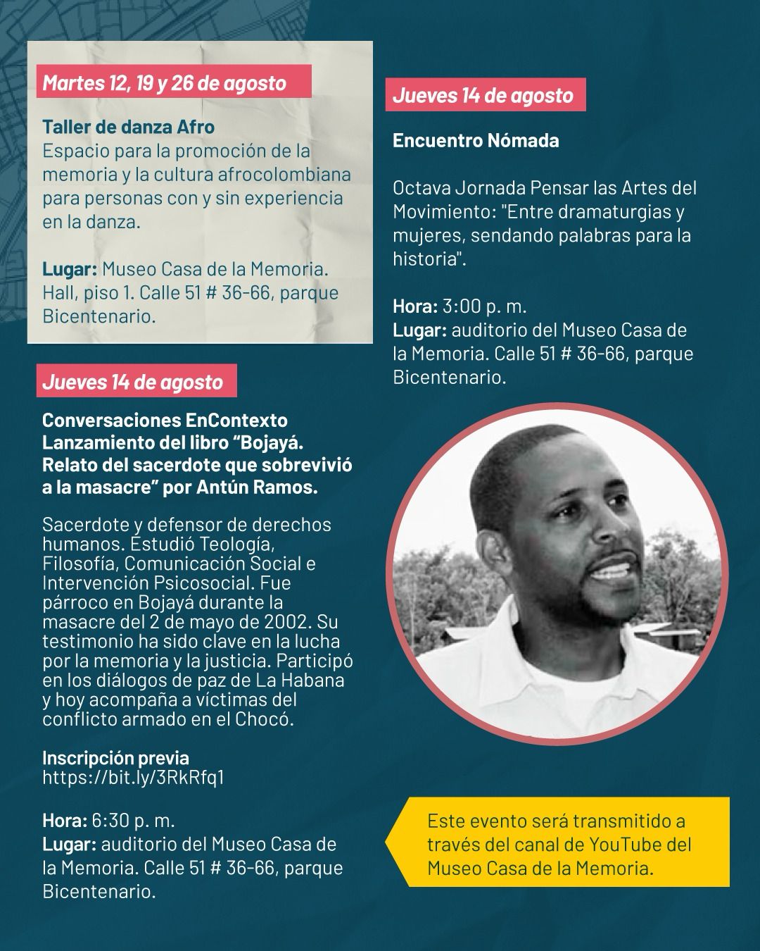 Este mes traemos una programación diversa, abierta y con entrada libre para todas las personas: talleres de danza afro, yoga, recorridos, cine al aire libre, encuentros de tejido, actividades en los corregimientos y espacios para conversar sobre memoria, territorio, cuerpo, arte y reparación. Entre ellos, destaca el lanzamiento del libro Bojayá. Relato del sacerdote que sobrevivió a la masacre, con la presencia de Antún Ramos.