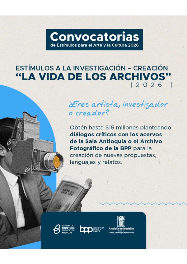 Esta es una oportunidad para que artistas, investigadores y creadores desarrollen propuestas que exploren y resignifiquen los acervos de la Sala Antioquia o del Archivo Fotográfico de la Biblioteca Pública Piloto. Las iniciativas seleccionadas podrán recibir hasta $15 millones para llevar a cabo procesos que conecten la investigación con la práctica artística y generen nuevas miradas, relatos y lenguajes a partir de estos archivos.
