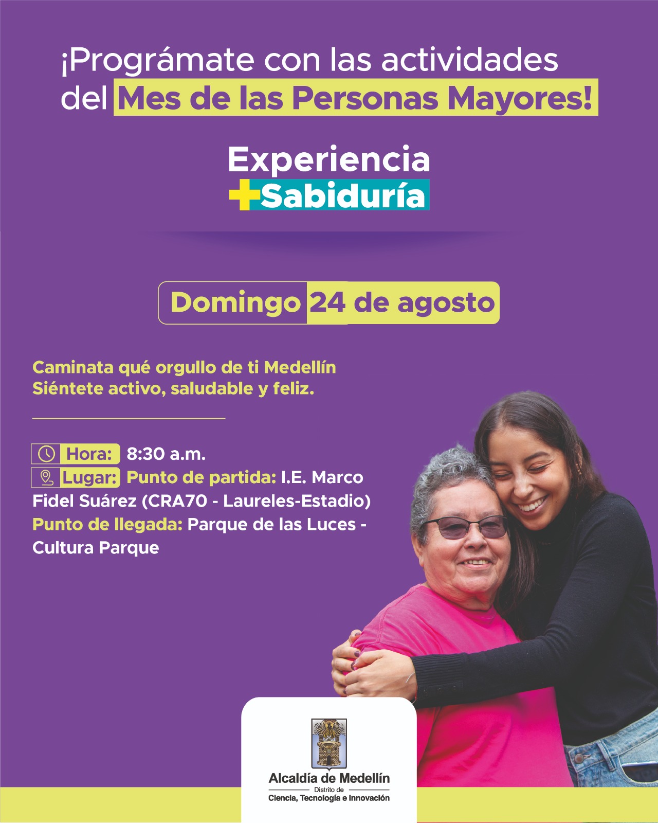 🚶♀️ 24 de agosto – Caminata Qué orgullo Medellín con más de 10.000 personas mayores y actividades culturales en el Parque de Las Luces.