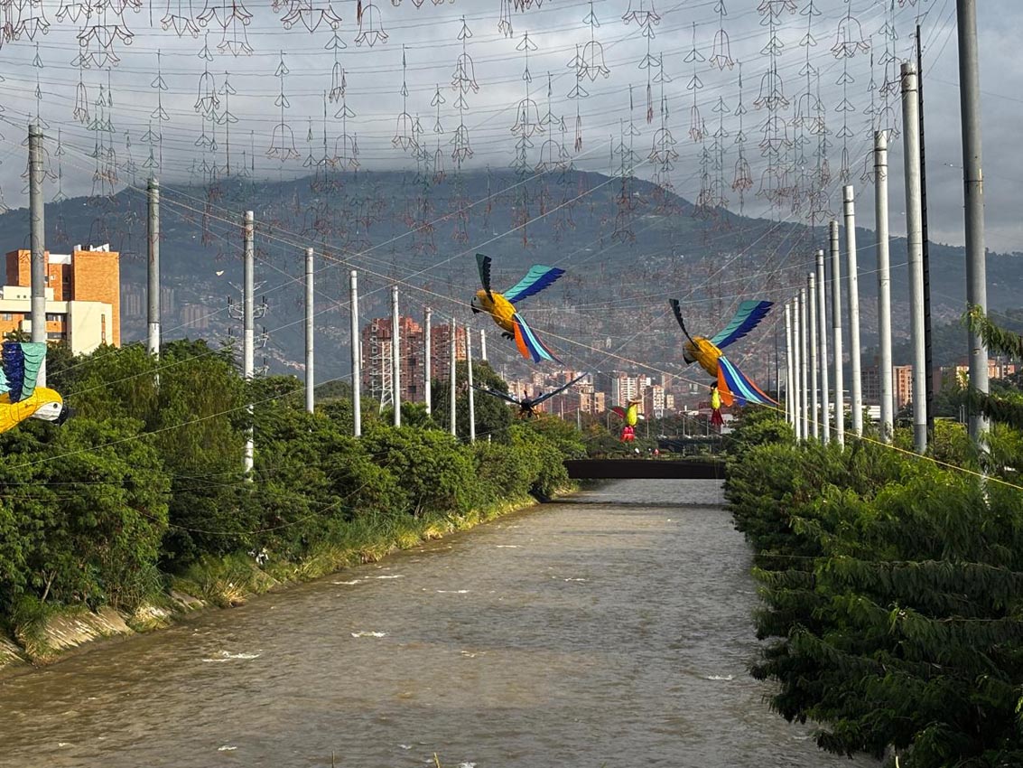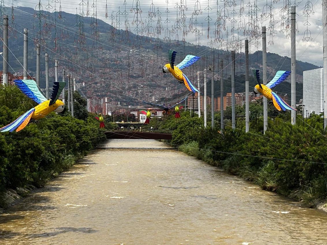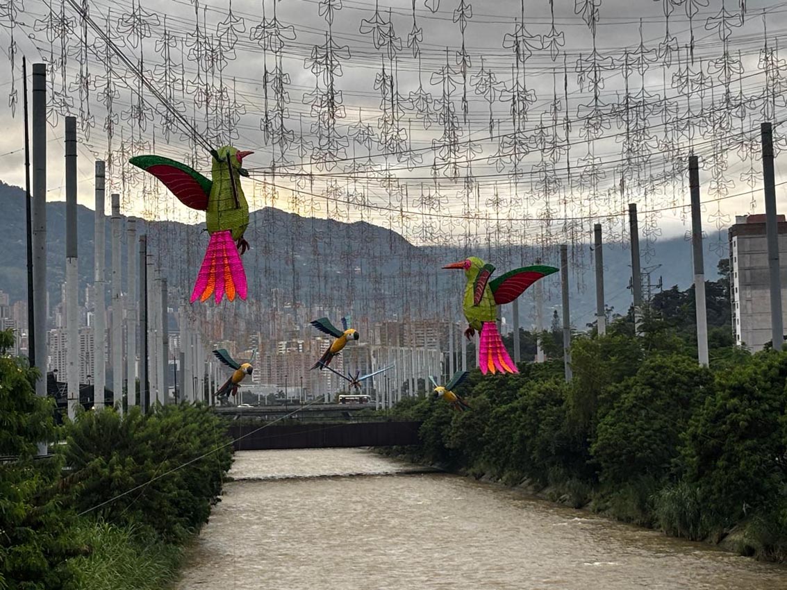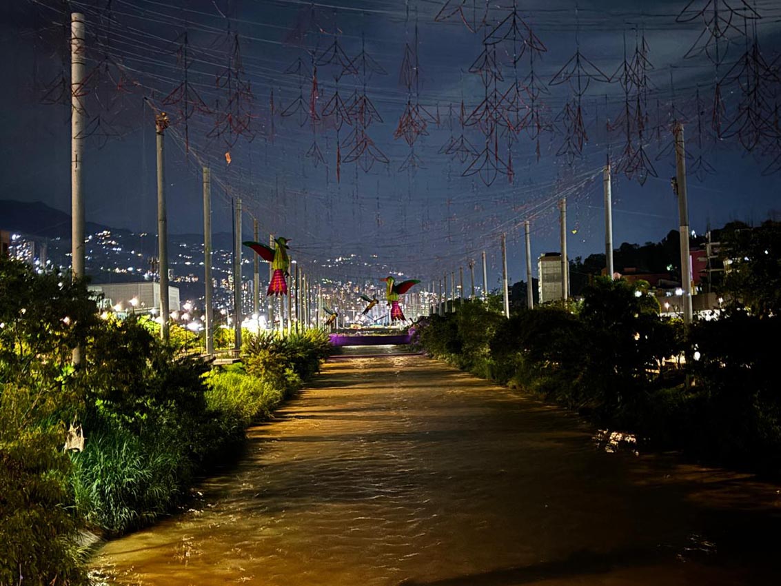 - El río Medellín luce un jardín colgante inspirado en la Feria de las Flores, con un espectacular techo luminoso compuesto por 9.121 flores hechas a mano, que recorren toda su extensión. Entre ellas se destacan: orquídeas, botones de oro, clavelinas, siemprevivas, San Joaquines, pensamientos, cartuchos y aves del paraíso. Cada flor cuenta con una programación electrónica que crea un vibrante juego de luces multicolor, llenando de movimiento y vida el La decoración se complementa con figuras monumentales colgantes de guacamayas rojas, colibríes, mariposas, abejas y libélulas que realzan la belleza natural del entorno.
