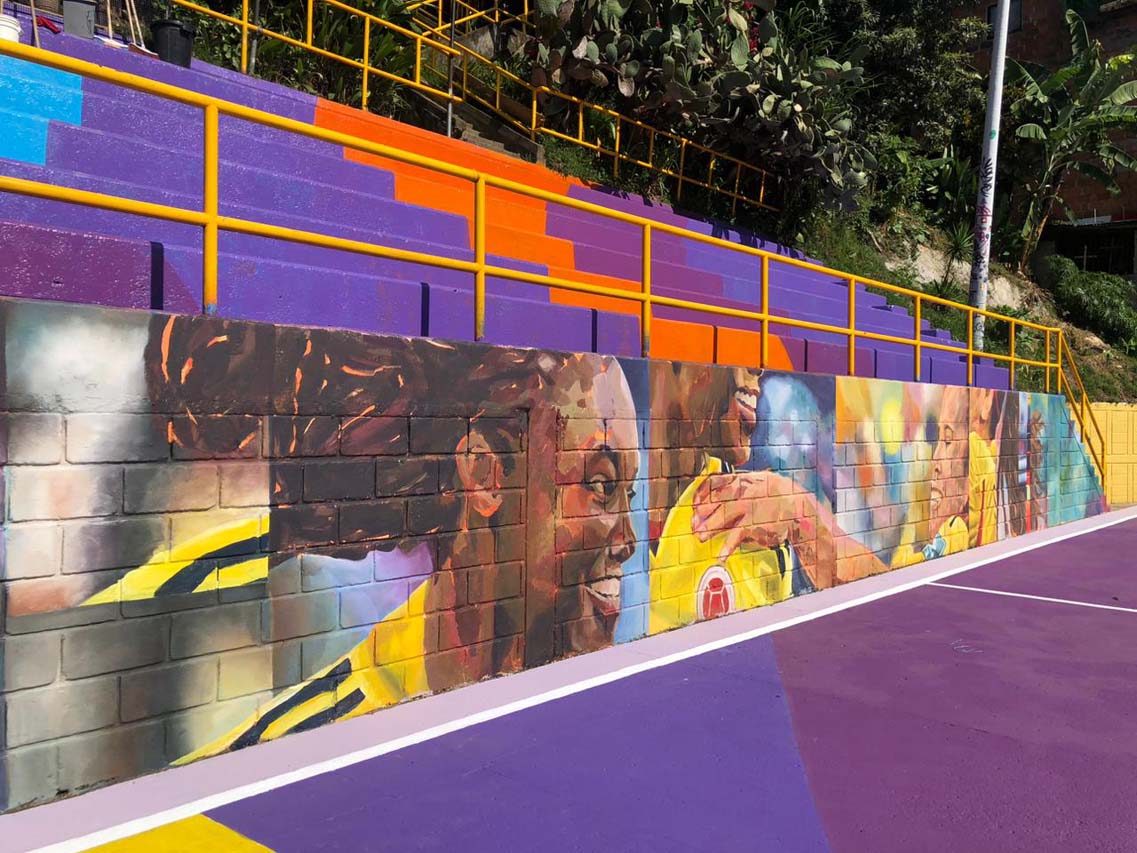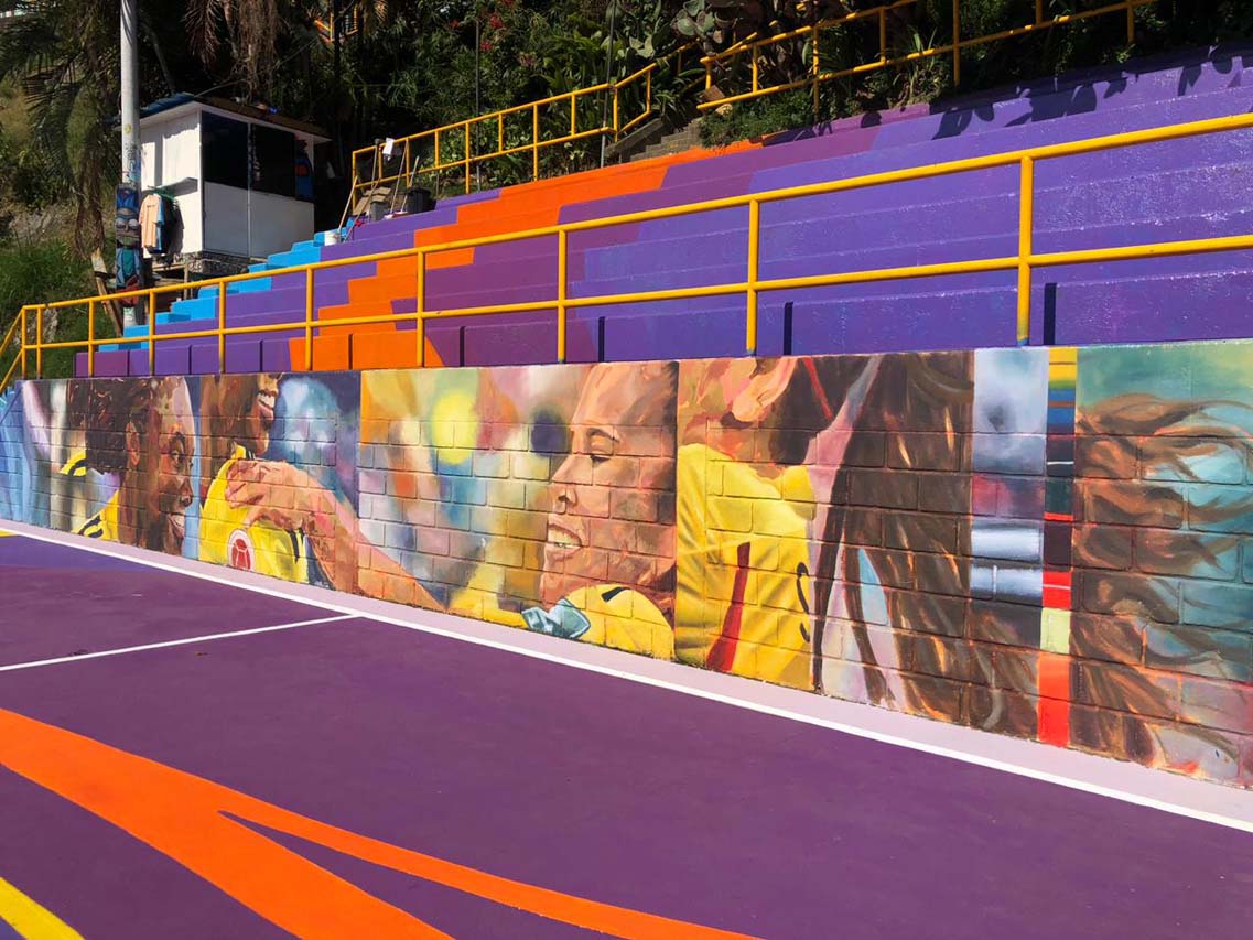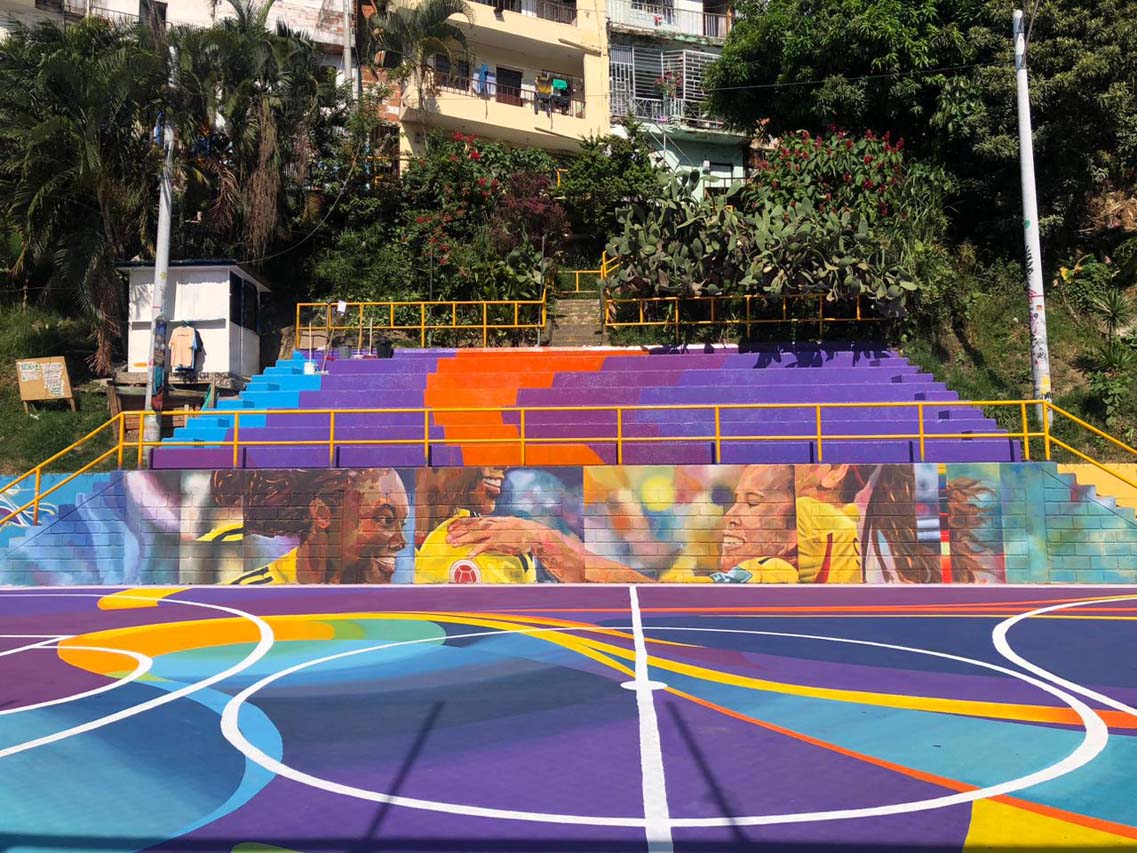 Ahora es viernes de la misma semana y ya está el resultado. La cancha parece nueva. En el piso sobresalen los morados, azules, amarillo, naranja y blanco. Y una gran sorpresa en el muro lateral: el grafiti con las caras de los tres hombres fue reemplazado por un mural figurativo con los rostros de dos estrellas de las selecciones colombianas de fútbol femenino: Linda Caicedo y Leicy Santos. Es una pintura que se asemeja a fotografías desarmadas.