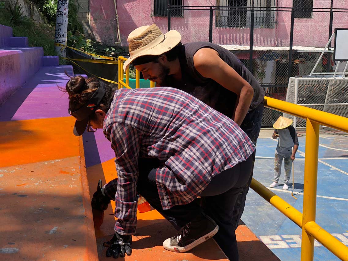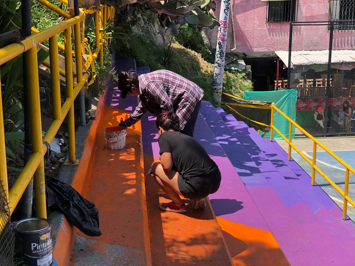 Jorge Cardona, “el Muerto”, y Juan Carlos Mosquera, “JuanC”, hacen los primeros trazos. Brochazos amarillos que van marcando la guía para la intervención del resto del equipo. Mientras tanto, otros van pintando los escalones de la gradería con morados, naranja y azul.