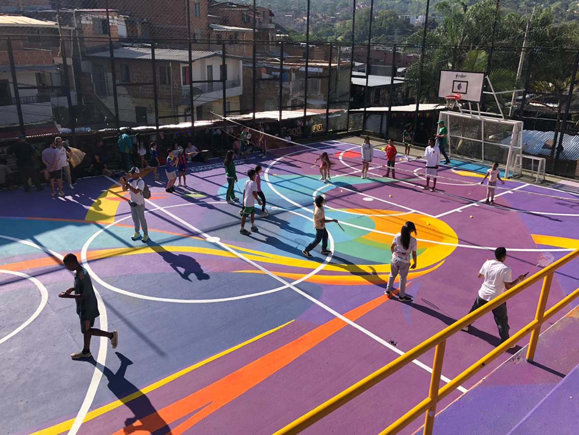 Corren, charlan, ríen; juegan baloncesto, microfútbol, bádminton. Niños y jóvenes se divierten en esta tarde de fiesta, como si estuvieran estrenando la cancha del sector La Independencia N° 1 del barrio 20 de Julio, justo donde comienza el grafitour de la comuna 13 (San Javier) de Medellín.