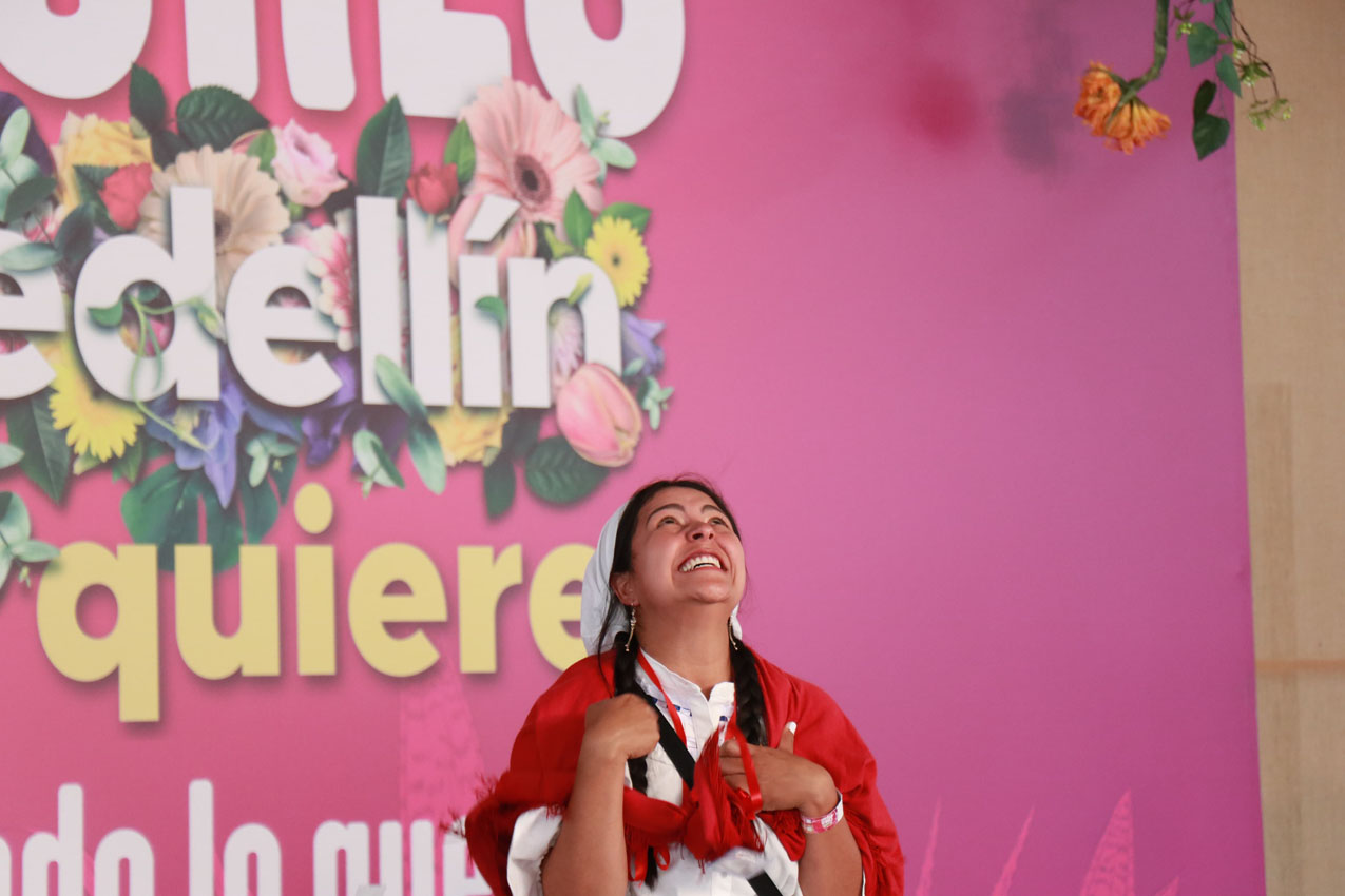 Con su espíritu alegra de niña se robó el show en la premiación y terminó entregando todos los premios al lado del Alcalde, la Primera Dama y el Gobernador de Antioquia.