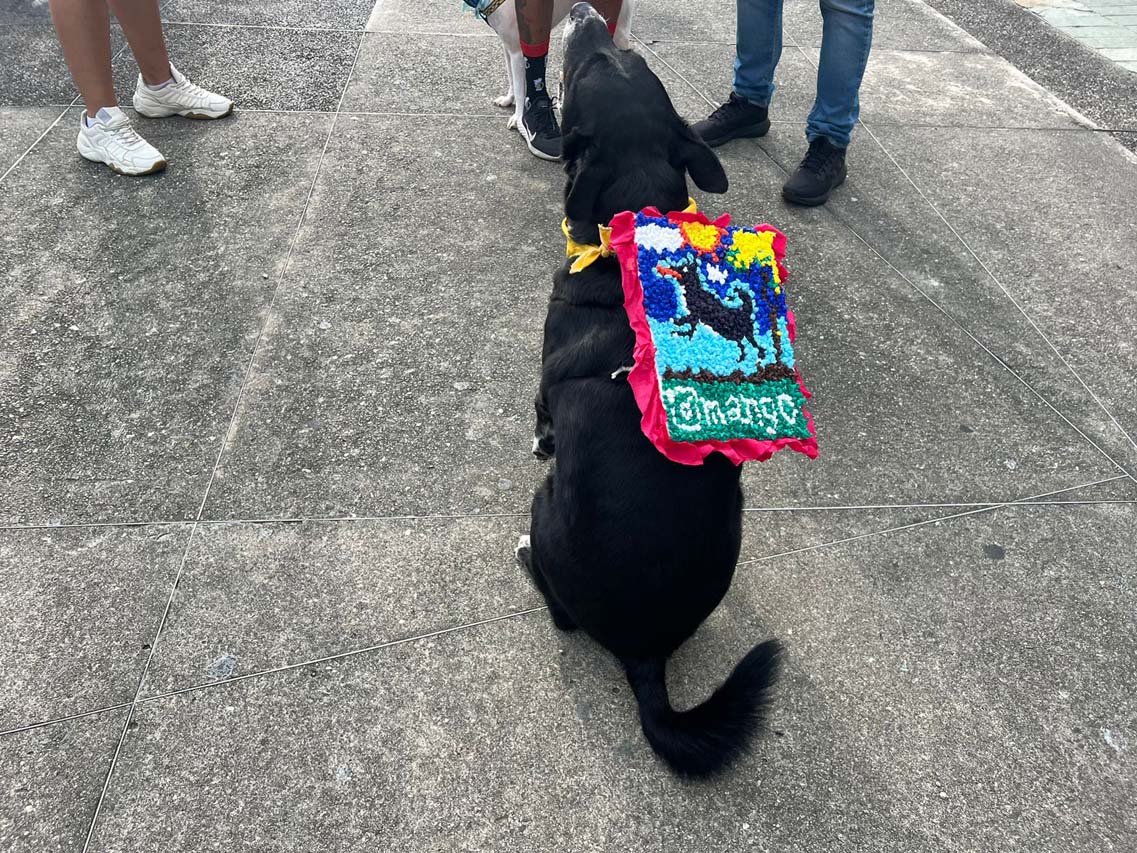 Mango en Tiritas no solo es uno de los productos que venden en la caminata. También es el nombre de la mascota de Juan Gonzalo Atehortúa. Se trata de un perro criollo negro de 10 años que en su lomo portaba una pequeña silleta elaborada con bolitas de papel globo. En su diseño, un perro negro saltando y cogiendo un disco con la boca y abajo, su nombre: Mango.