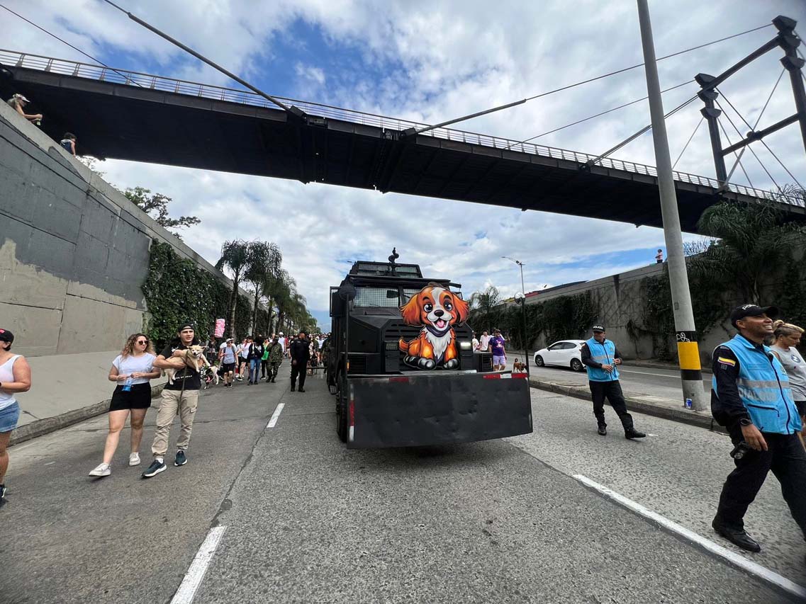 Por la carrera 70 llegamos hasta San Juan y de ahí hasta la carrera Carabobo. La mañana iba avanzando y aunque el cielo seguía grisáceo, se sentía bochorno. Una tanqueta de la Policía iba humedeciendo las vías para que los caninos no sufrieran en sus huellas con el pavimento caliente.