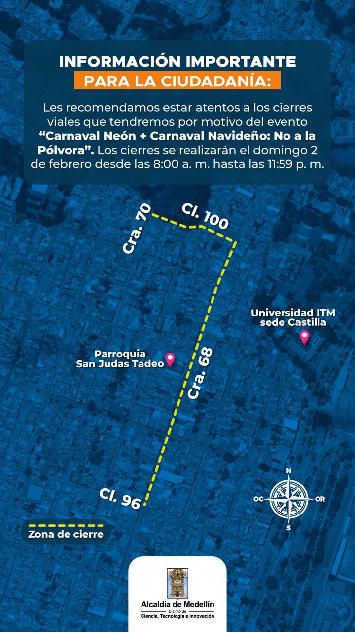 En la comuna 5-Castilla, por el Carnaval Neón y Carnaval Navideño No a la Pólvora, este domingo 2 de febrero, es necesario el cierre de la carrera 68 entre calles 96 y 101, la calle 100 entre carreras 68 y carrera 70; la calle 97 entre carreras 67 y 69; la calle 98 entre carreras 67 y 69; la calle 99 entre carreras 67A y 69; la calle 99A entre carreras 67A y 69; y la carrera 69 entre calles 99 y 100A. Estos cierres iniciarán desde las 8:00 a. m. y se extenderán hasta las 11:59 p. m. de ese día.