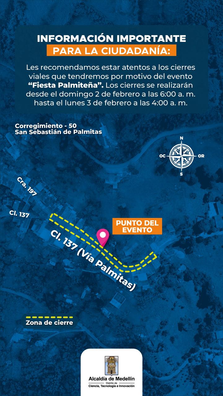 También, el corregimiento Palmitas tendrá su tradicional Fiesta Palmiteña con cierres entre las 6:00 a. m. del domingo y con desmontaje hasta las 4:00 a. m. del lunes. Habrá afectación de la calle 137 entre carrera 197 y calle 137.