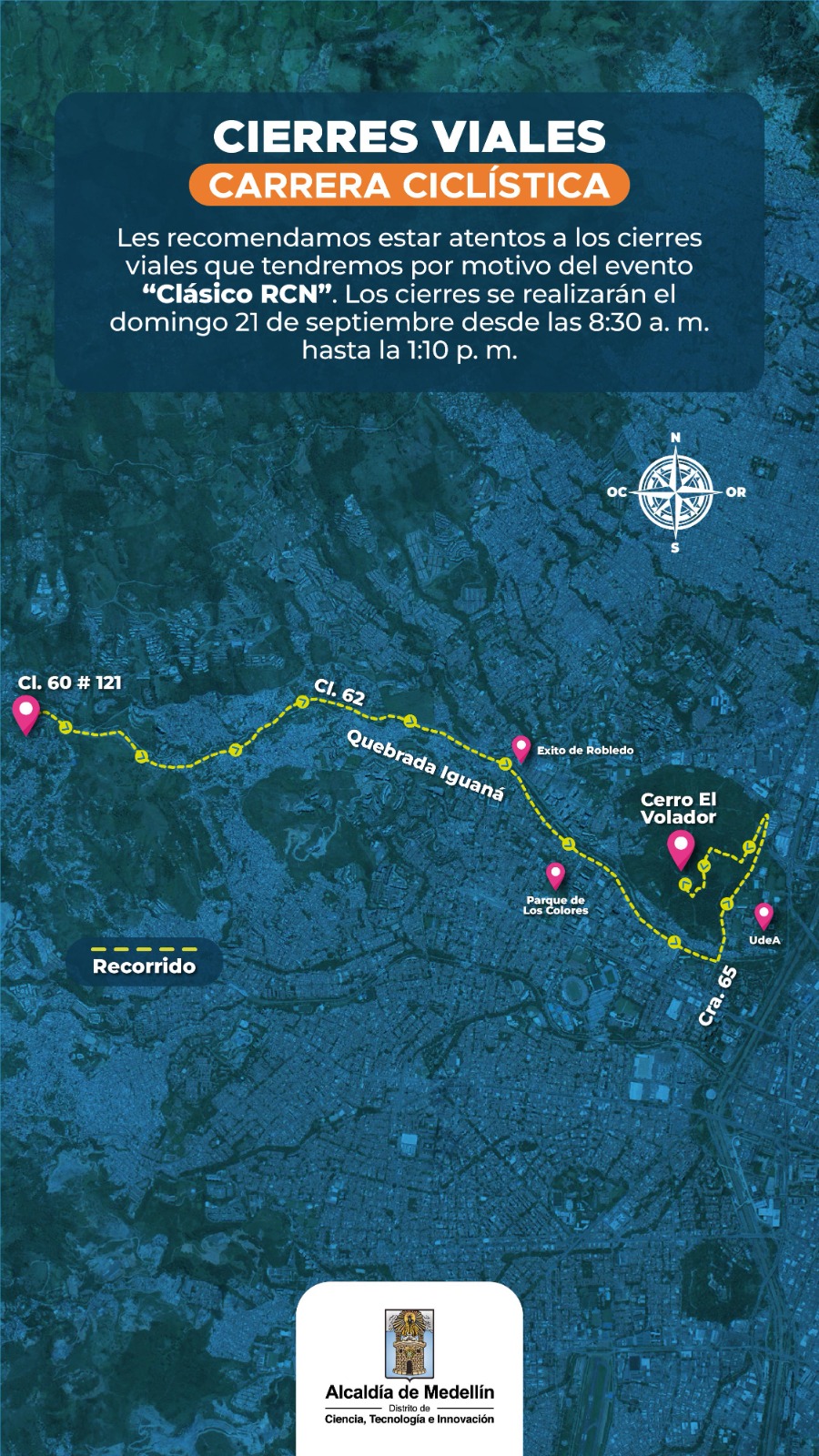 El Clásico RCN se correrá en Medellín el domingo 21 de septiembre, con cierres entre las 8:30 a. m. y la 1:10 p. m. El recorrido ingresará por la calle 60 con carrera 121, se conectará con la canalización de la quebrada La Iguaná y finalizará en el Cerro El Volador. Durante este tramo se afectarán corredores como la calle 60 entre las carreras 121 y 80, la calle 58 entre las carreras 110 y 98A, la calle 62 entre las carreras 98A y 85, la calle 55 entre las carreras 77B y 65, y la carrera 65 entre las calles 57 y 67, entre otros sectores del occidente.