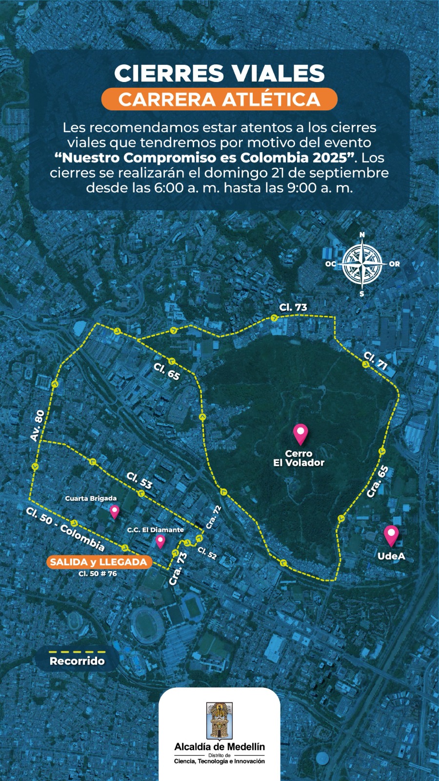 Ese mismo día, en horas de la mañana, se realizará la carrera atlética Nuestro Compromiso es Colombia 2025 en las comunas 11 (Laureles), 12 (La América) y 7 (Robledo). La competencia se desarrollará entre las 6:30 y las 8:10 a. m., con cierres en la calle 50 desde la carrera 74 hasta la 79 en la calzada norte sentido oriente–occidente. Para el montaje y desmontaje de la tarima se dispondrá de cierres desde las 4:00 hasta las 10:30 a. m.