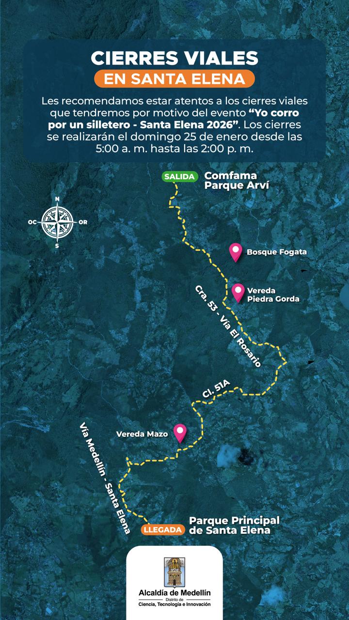 La dependencia también informó que hará cierres viales temporales este domingo 25 de enero en el corregimiento Santa Elena, por el evento deportivo Yo corro por un silletero, que tendrá recorridos de 5 K y 10 K. Habrá cierre total de vías rurales entre las 5:00 a. m. y las 2:00 p. m., para las labores de montaje, desarrollo y desmontaje del evento.