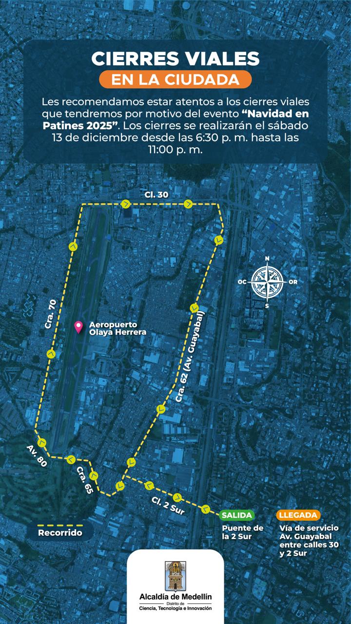 Se autorizaron diversos cierres totales y parciales en la calle 2 sur para las labores de montaje y desmontaje entre el 11 y el 14 de diciembre. El trayecto avanzará por la calle 2 sur, la carrera 52 (avenida Guayabal), calle 6 sur, carrera 54, avenida 80, las carreras 70A, 70 y 69B, la calle 30 y nuevamente la carrera 52. Los cierres serán intermitentes, ya que los participantes se desplazarán en bloque, y el evento contará con el acompañamiento de 23 agentes de tránsito para garantizar la seguridad y la adecuada regulación vial.