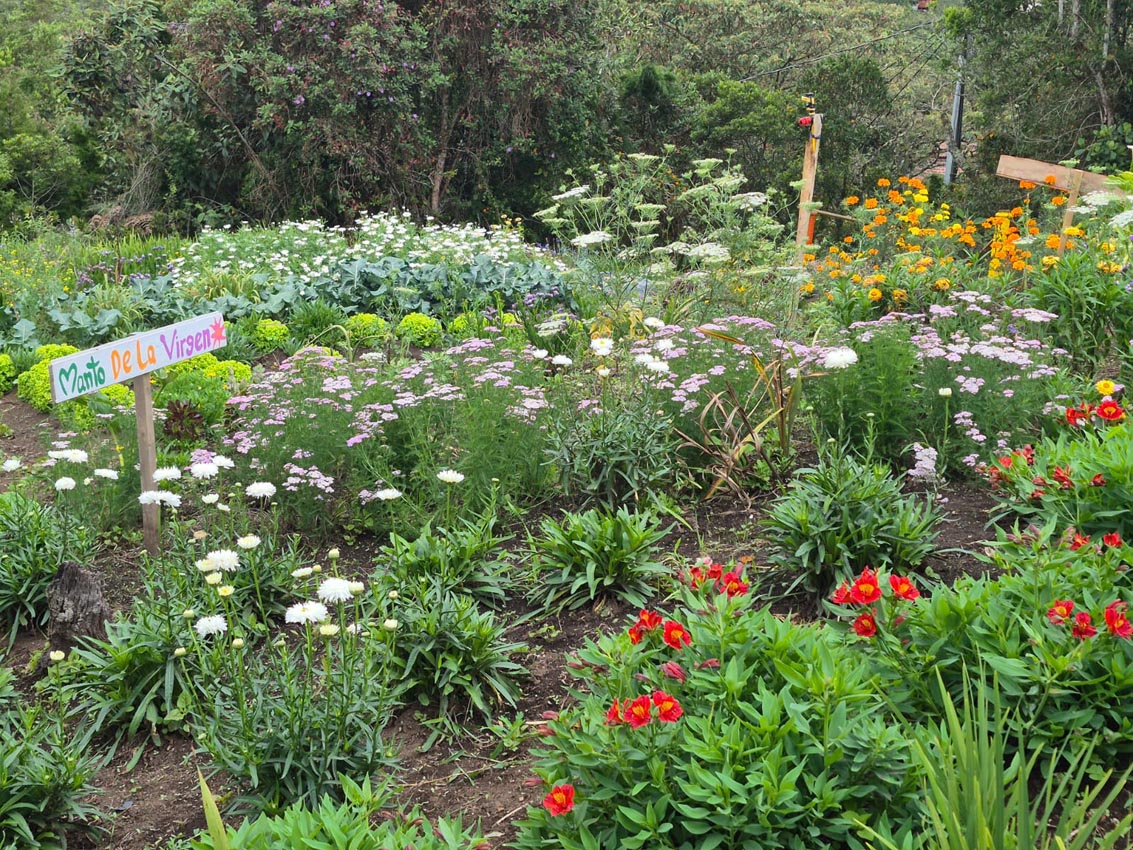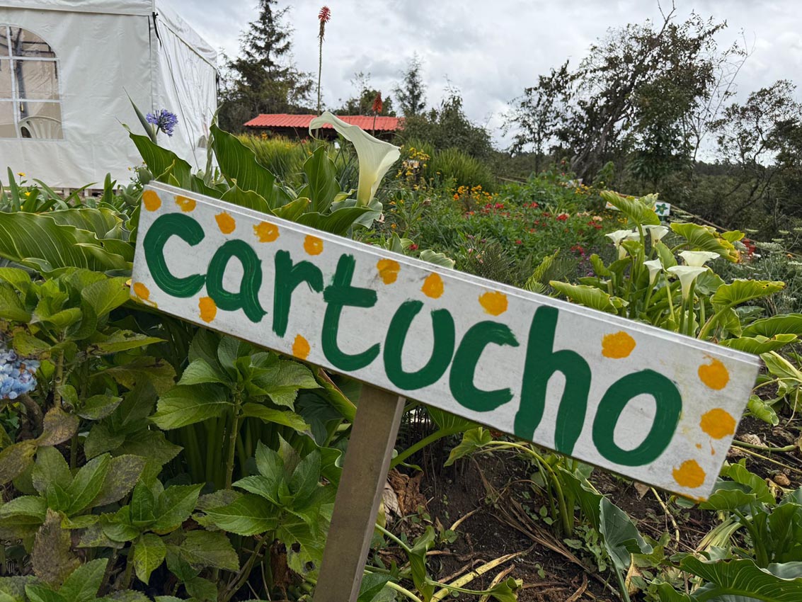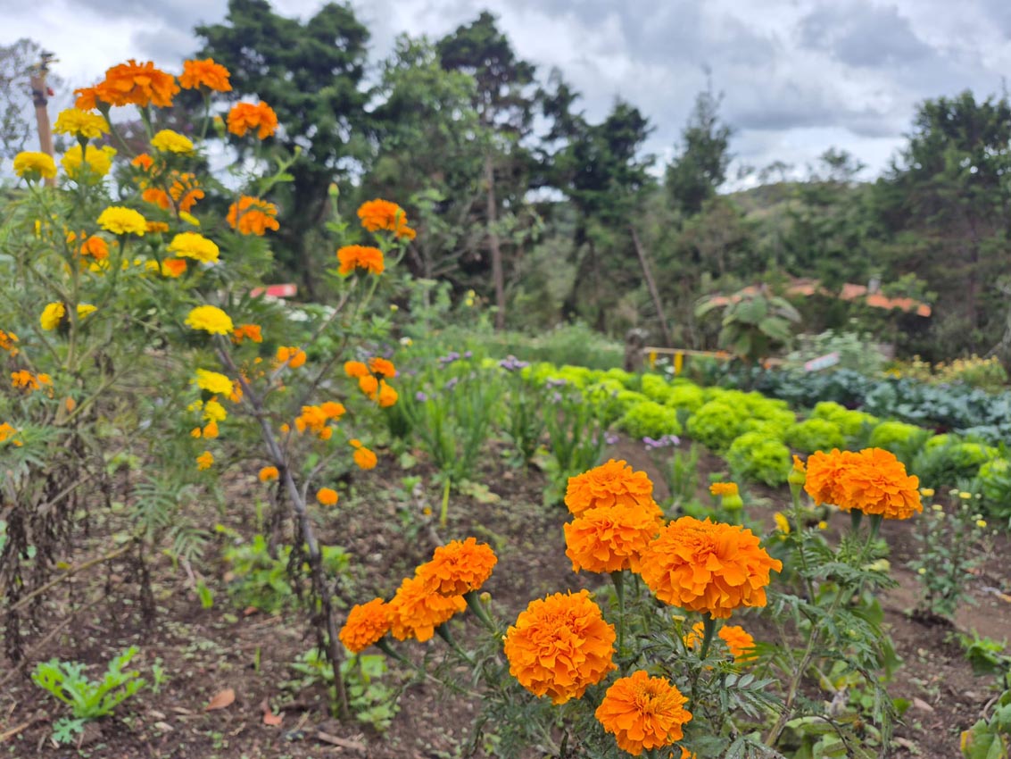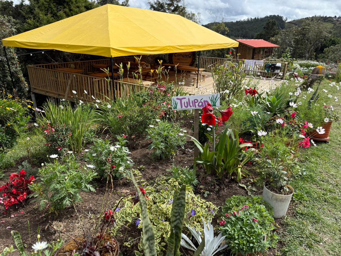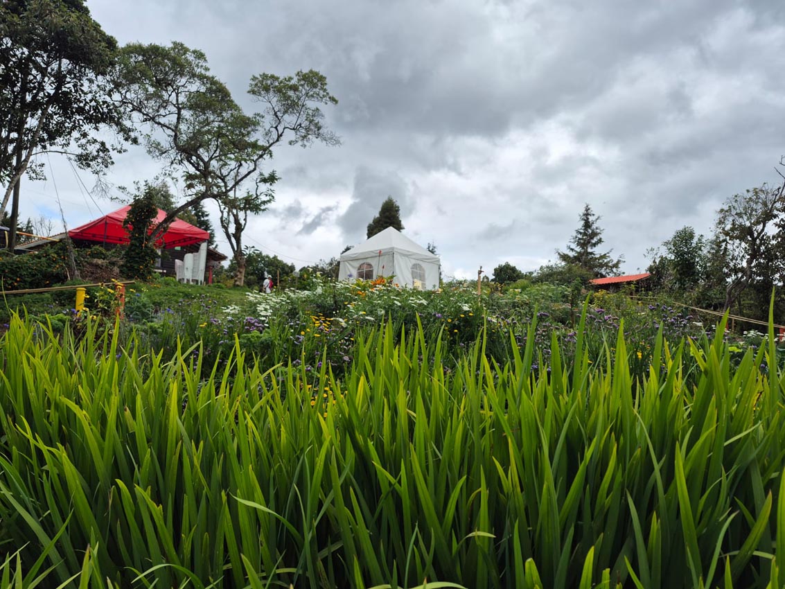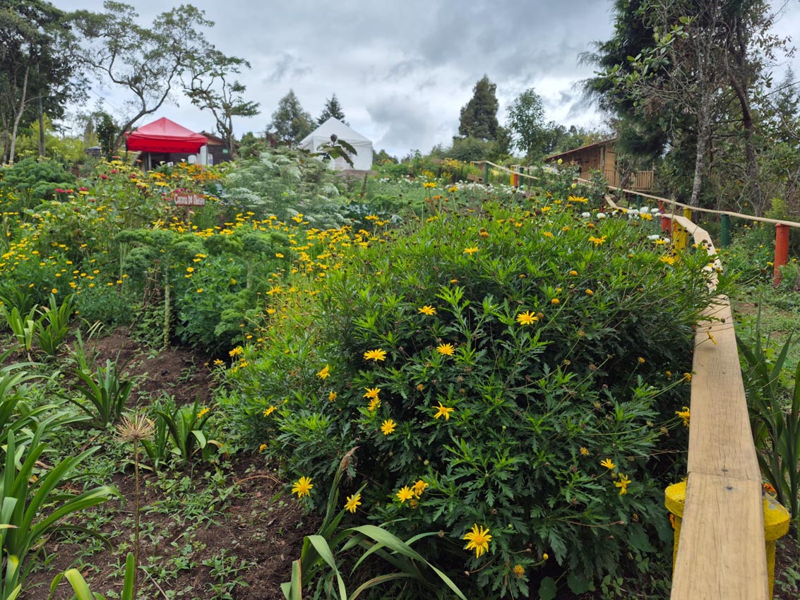 En el medio está el prado, en el que los grupos disfrutan noches de vino o de luna llena y, por supuesto, hay un gran jardín con clavel, estrella de Belén, siempreviva, estatis, chispa, botón de oro, dalia… Una colorida fiesta de amarillo, blanco, rojo, morado, naranja y el fondo verde de esta tierra fría que supera los 2000 metros sobre el nivel del mar.