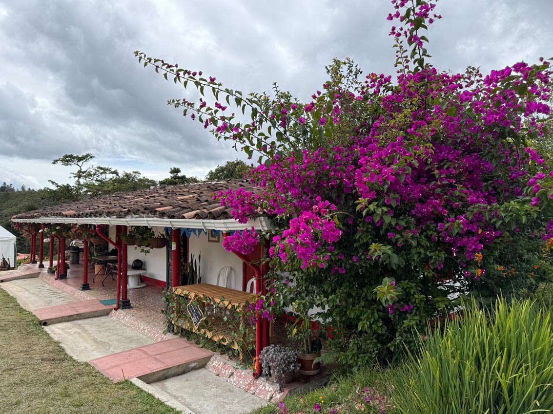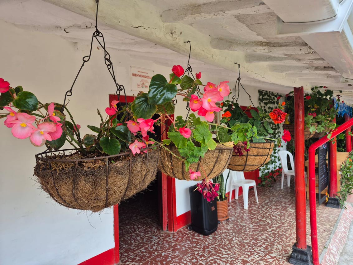 La casa es paisa tradicional: blanca, de puertas y ventanas rojas de madera y con típicas materas colgantes, con begonias y novios, que decoran la fachada.