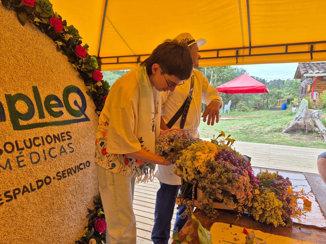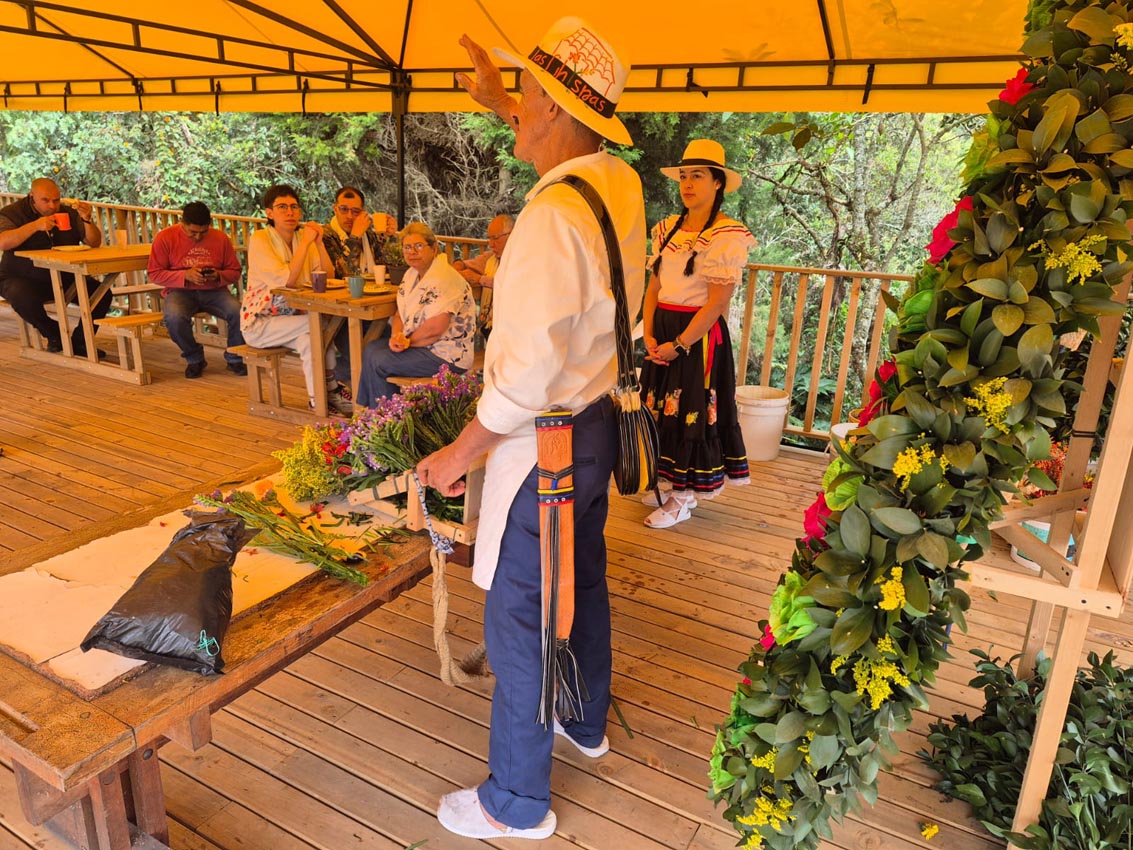 En el auditorio los turistas desayunan arepa de chócolo con quesito y chocolate. Luego, Heriberto y Lina les exponen la historia de la silleta y la elaboración de una tradicional. Él explica que hay flores que cogen en la mañana de la víspera del desfile, las hidratan durante cuatro horas y luego arman la silleta.