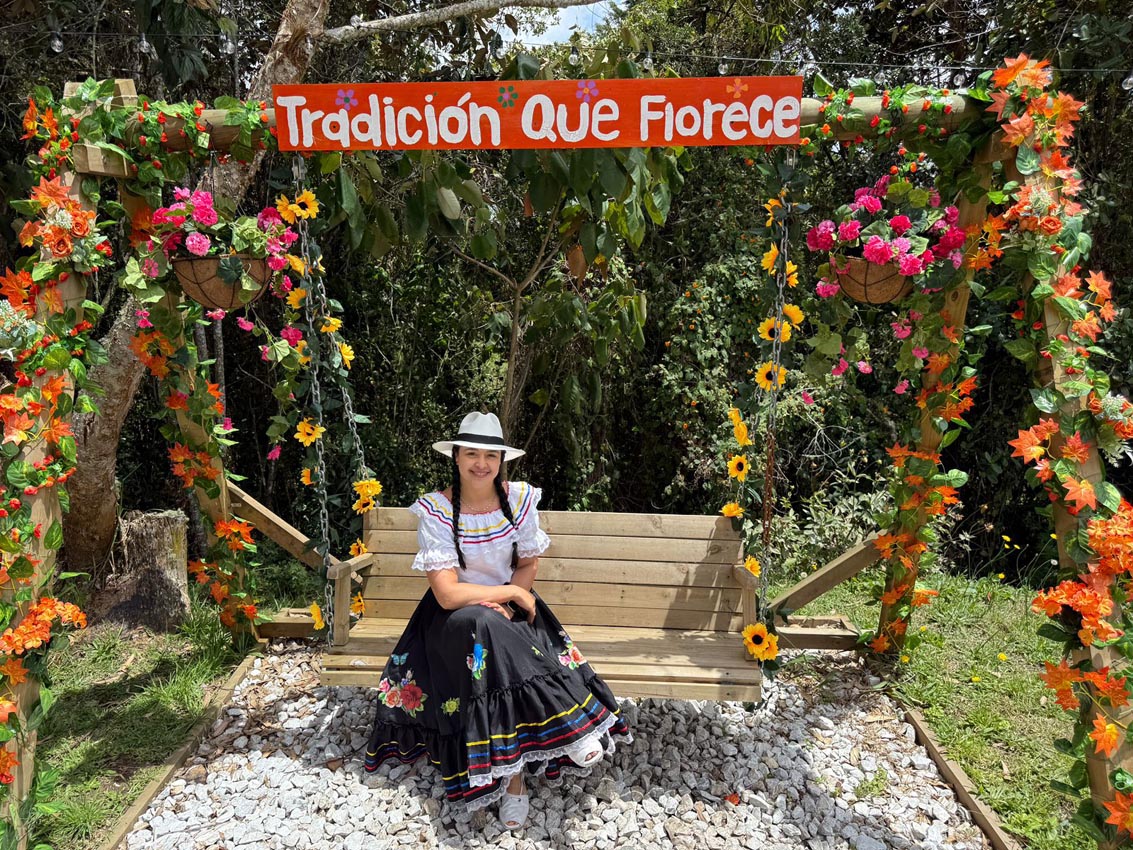La francesa Tatiana Raitif, de los grupos de turistas que en este momento están en la finca, visita Colombia por primera vez. Afirma que le gustó conocer la cultura silletera y saber que es una tradición que se transmite entre generaciones, como se ve en esta familia, desde bisabuelos hasta bisnietos.
