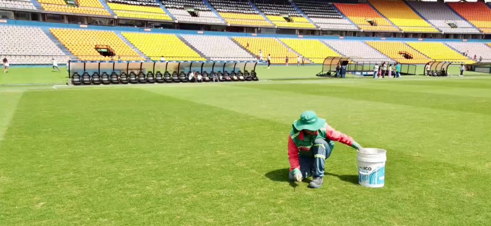 El mantenimiento del césped natural del estadio incluye labores como corte, cepillado, aireación y aplicación de top dressing (arena) para mejorar el drenaje, nivelar la superficie y garantizar condiciones de juego. La arena visible es parte normal del proceso y no afecta el rendimiento.