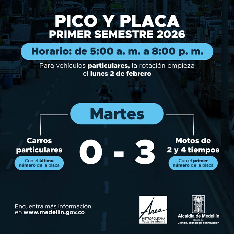 Este lunes 2 de febrero, Medellín y su área metropolitana tendrán una nueva rotación del Pico y Placa para carros y motocicletas, que regirá durante el primer semestre de 2026 y hasta el 31 de julio. Para este primer día, la restricción aplica para los números 1 y 7.
