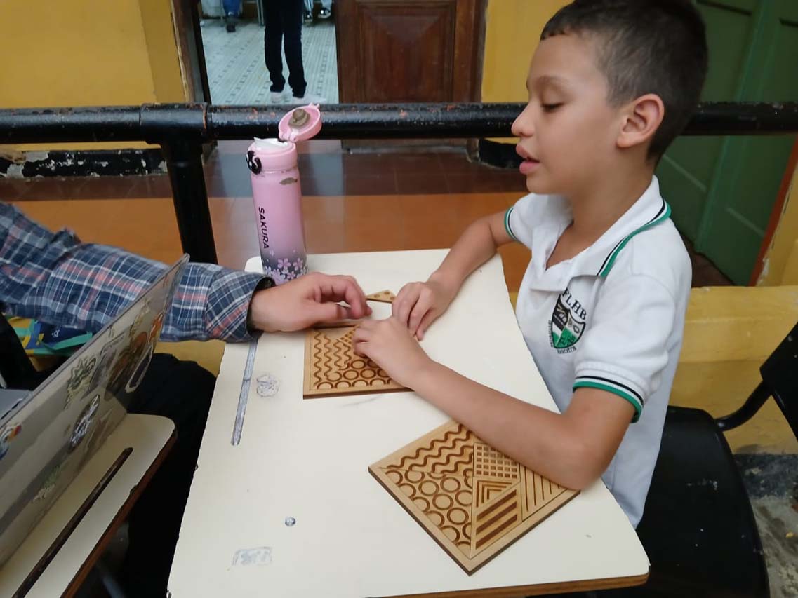 Del otro lado del salón, los niños con discapacidad visual escuchan atentamente las indicaciones del docente que les va pasando objetos, y ellos palpando suavemente van identificando formas y texturas, así van conociendo el mundo, haciéndose una idea de ese lugar en el que habitan y del que los otros hablan porque, aunque sus ojos no perciban todo, sus otros sentidos están agudizados y de esta manera dotan de orden y significado el espacio exterior.