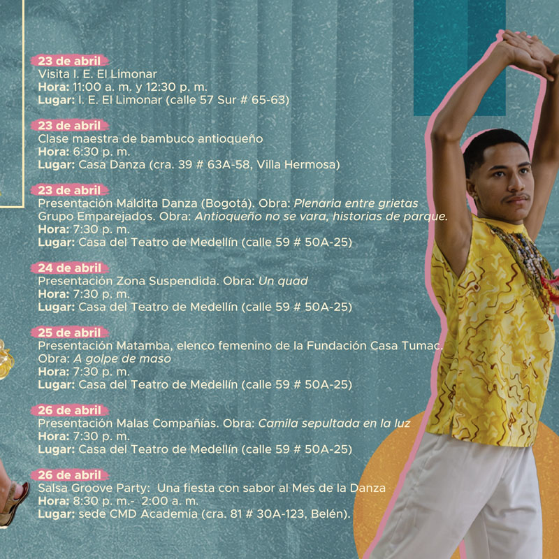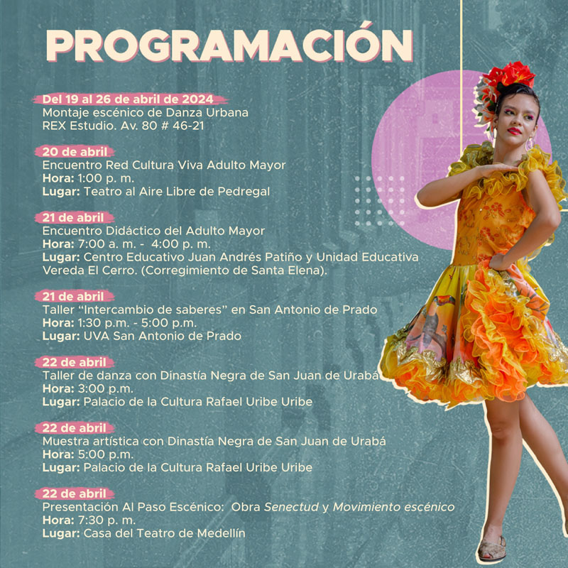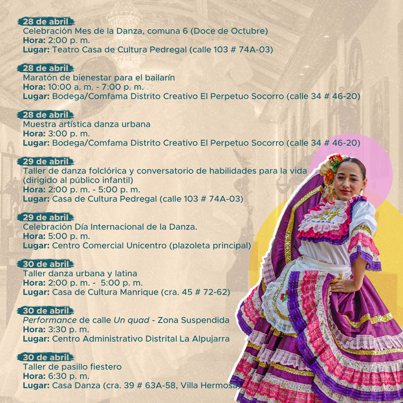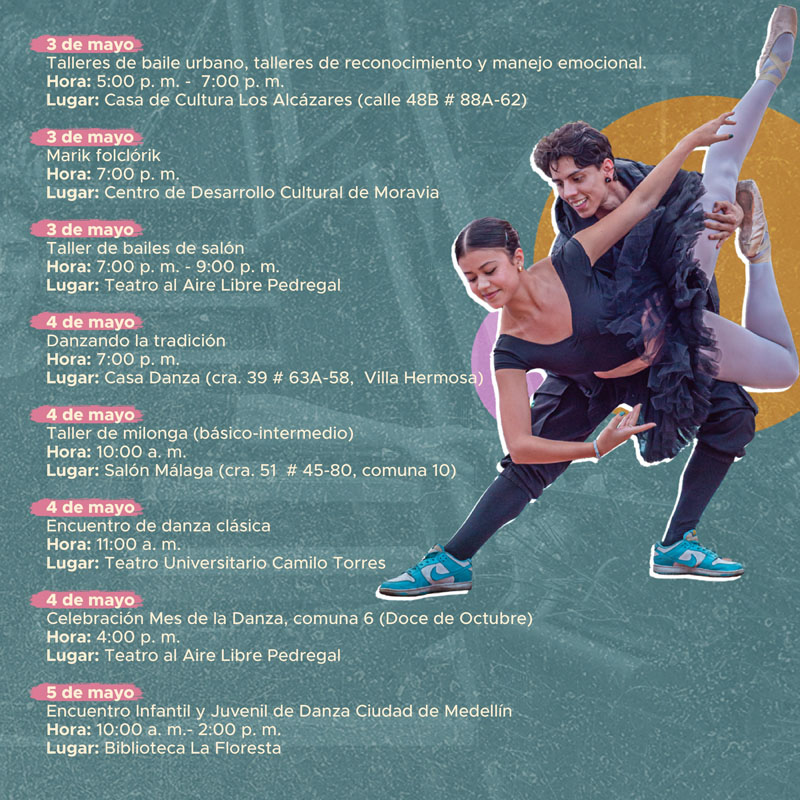 La danza clásica, el baile urbano, el ballet, el porro, la salsa, el tango, los bailes latinos y otros géneros tradicionales como el bambuco, se tomarán espacios como instituciones educativas, la UVA de San Antonio de Prado, la Casa del Teatro de Medellín, centros comerciales, casas de la cultura, el Museo de Antioquia, entre otros, con el objetivo de acercar esta expresión artística a nuevos públicos, fortalecer los procesos de formación e impulsar el talento local.