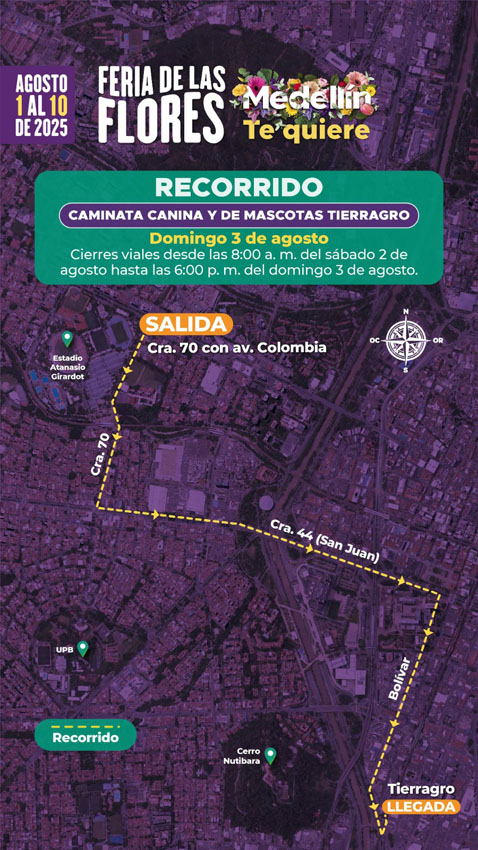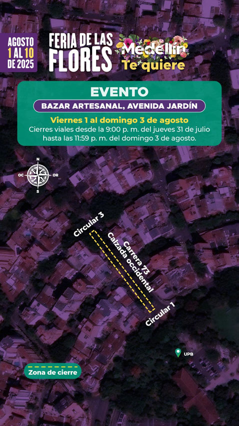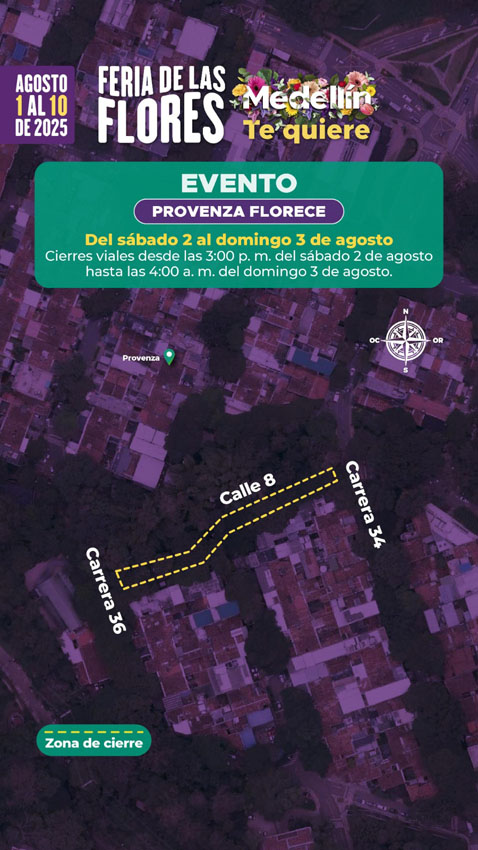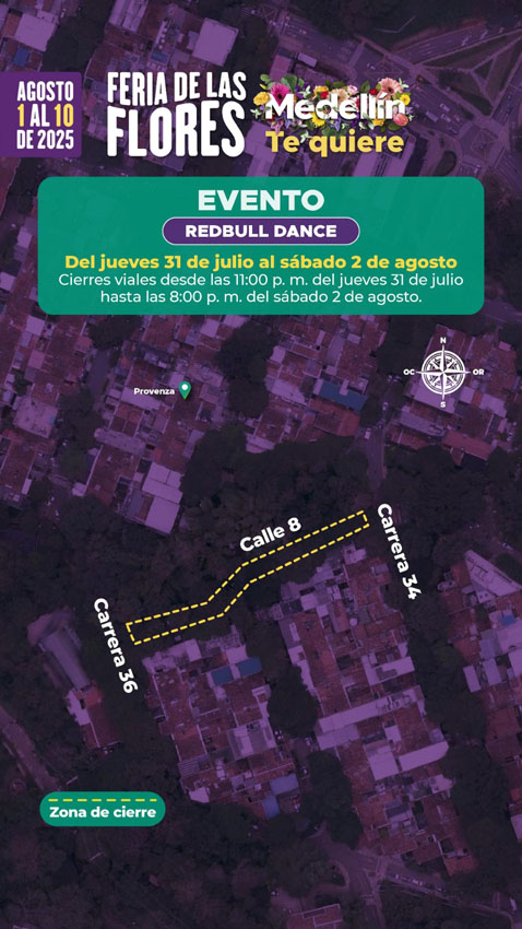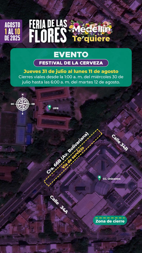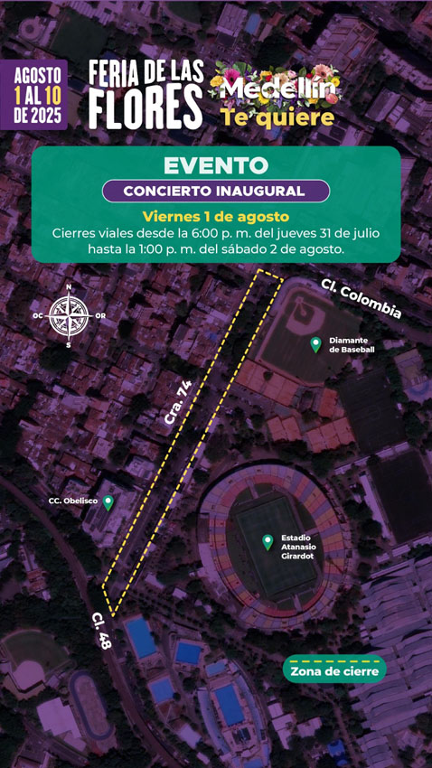El viernes 1 de agosto, Medellín tendrá el concierto inaugural de la Feria de las Flores. Para este evento se han programado cierres viales desde las 8:00 a. m. del viernes 1 de agosto hasta la 1:00 a. m. del sábado 2 de agosto, en la carrera 74 entre calles 48 y 48A (ambas calzadas). El cierre incluye la calle 48B entre carreras 74 y 75, y la carrera 72 (acceso piscinas Estadio Atanasio Girardot) entre calle 48 y carrera 74.