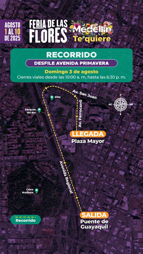 El domingo 3, Medellín también disfrutará del Desfile Avenida Primavera. Para el montaje y logística de este evento, se ha programado el cierre total de la avenida Regional entre calles 19A y 30, desde las 4:00 a. m. hasta las 6:00 p. m. Para el recorrido, que se realizará entre las 3:00 p. m. y las 6:00 p. m., habrá cierres totales y parciales con afectación en la avenida Regional a la altura del Puente de Guayaquil, calle 44 (avenida San Juan), carrera 57 (avenida del Ferrocarril) y alrededores de Plaza Mayor, sitio de llegada del desfile.