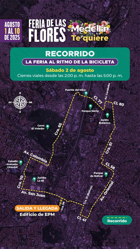 También el sábado, Medellín vibrará con la Feria al Ritmo de la Bicicleta, con un recorrido de 13K, que tiene programados cierres viales parciales y totales durante el montaje, en horarios entre las 10:00 a. m. y las 8:00 p. m., teniendo en cuenta que el recorrido inicia desde las 2:00 p. m. en la carrera 58 entre calles 42 y 43 (contiguo al edificio EPM) y termina en la intersección con la calzada occidental de la carrera 58. Habrá afectación en la carrera 58 (ambas calzadas), calle 44, carrera 51 calzada oriental, calle 41, carrera 46 (avenida Oriental), calle 58, carrera 50C, calle 59, calle 80, carrera 52, calle 77, glorieta Terminal del Norte, transversal 78, carrera 65, calle 51 y carrera 70.