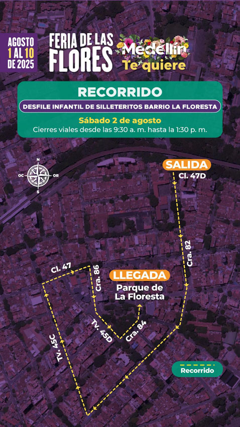 El sábado 2 de agosto, en La Floresta, se llevará a cabo el Desfile Infantil de Silleteritos, con un recorrido que incluye cierres parciales y totales desde su inicio en la calle 47D con carrera 82. Continúa por esta última al sur hasta la transversal 45C, gira por esta al norte hasta empalmar con la carrera 87 y sigue al norte; en la calle 47 gira al oriente hasta la carrera 86, por esta al sur hasta la transversal 45D y, bordeando el Parque de La Floresta, continúa al sur hasta la carrera 84; por esta al norte hasta la calle 46, donde finaliza el evento. Estos cierres, incluyendo logística y montaje, se ejecutarán entre las 5:00 a. m. y las 3:00 p. m., y el desfile está programado entre las 10:00 a. m. y la 1:00 p. m.