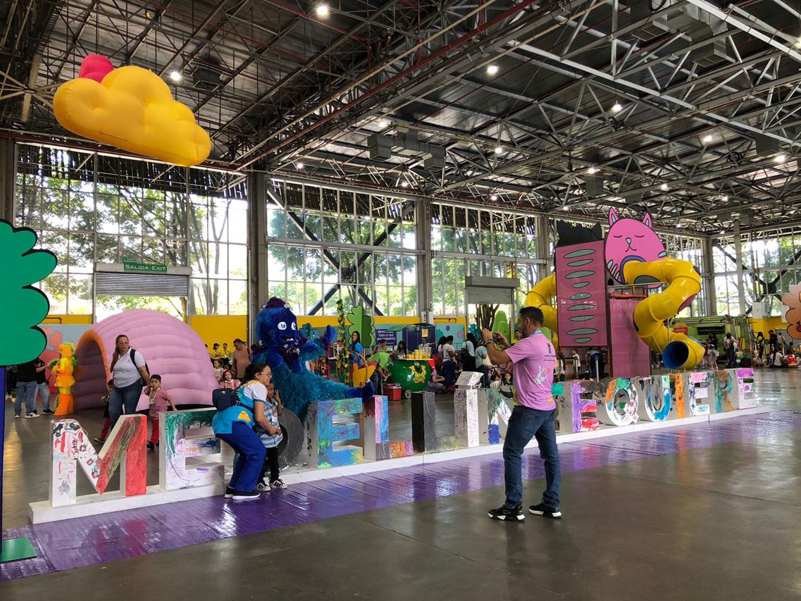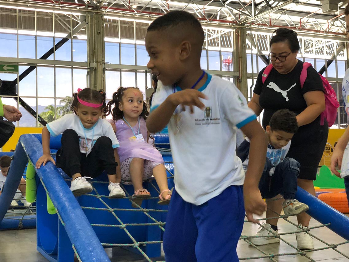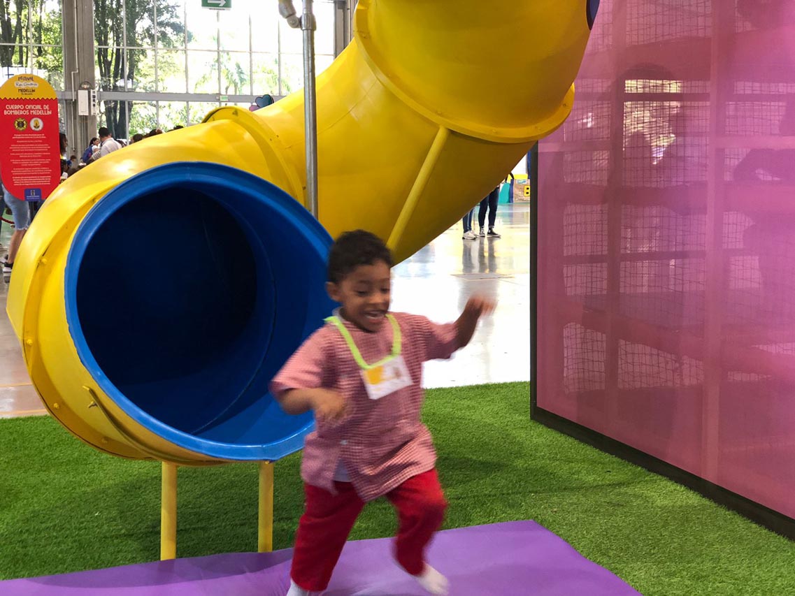 Y el pabellón Amarillo es el epicentro de los juegos. Entre ellos, el ‘Gato Lengüilarga’, la pista de bicis de la Secretaría de Movilidad, donde aprenden qué es una glorieta, por ejemplo; el inflable con palmeras y sol para que salten y se deslicen, el espacio de Emvarias para que jueguen y se formen en la limpieza y cuidado de la ciudad. “Medellín es un columpio y un sol”, dice la frase de Luciano, de cuatro años, en la entrada de este pabellón.