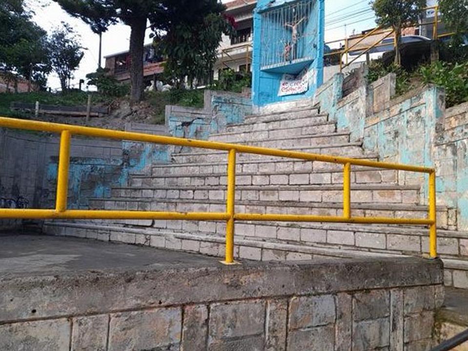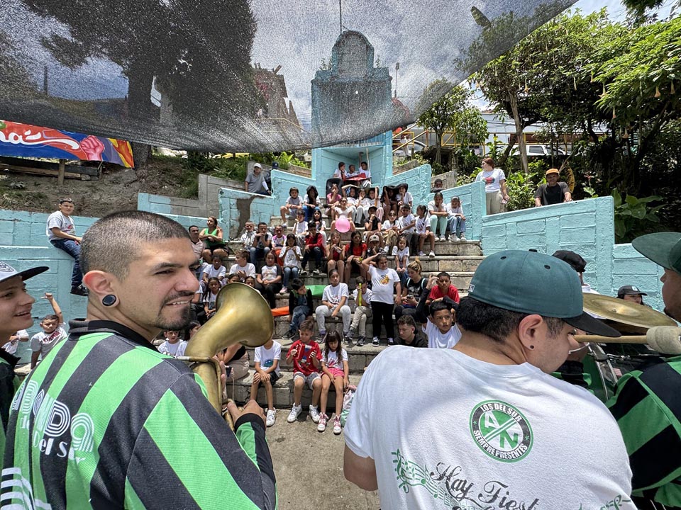 Las escaleras como sala y palcos para recibir el público, un escenario enmarcado por zonas verdes y grafitis que expresan el arte comunitario y viviendas aledañas como acogedores bastidores.