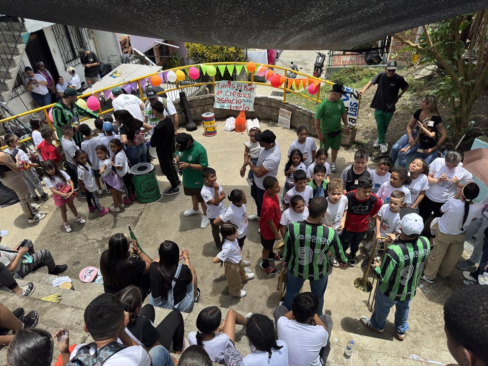 En septiembre del presente año, 220 personas de las Escuelas de Participación 90 niños, 120 estudiantes de diplomados y 10 jóvenes de la Escuela de Barristas del Atlético Nacional, con el acompañamiento de trabajadores de Emvarias, se articularon para recuperar el teatro y devolverlo a la comunidad.