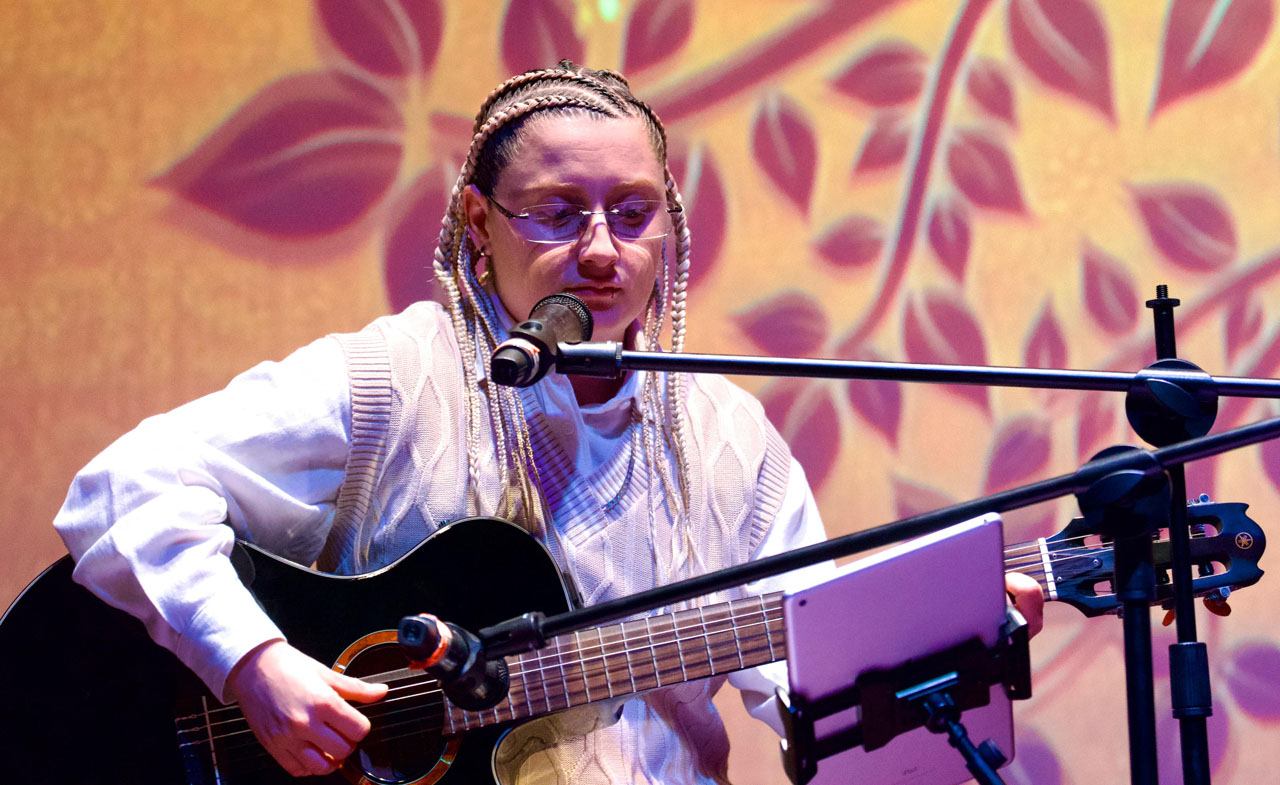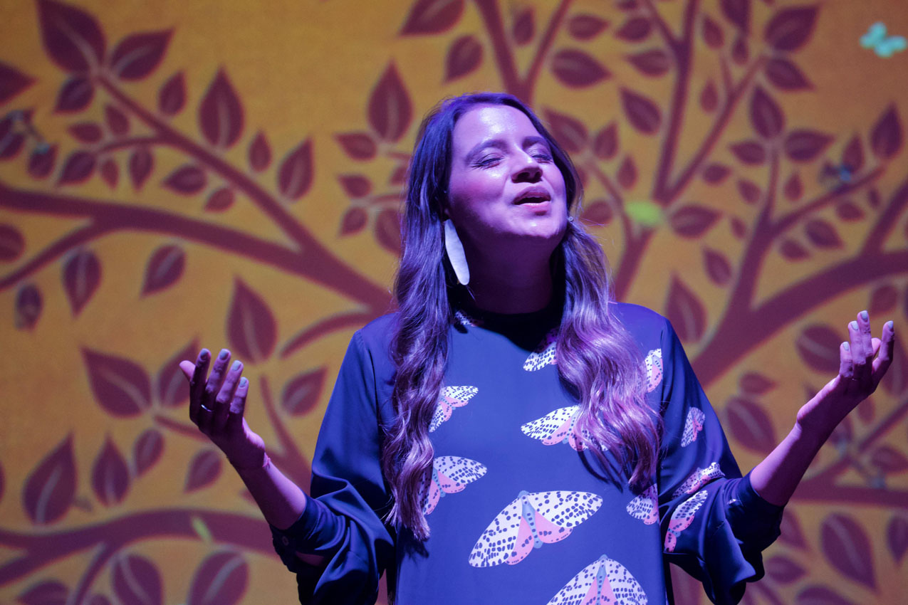 5:45 p. m. Iba cayendo el sol y al tiempo se apagaron las luces del auditorio para lograr mejor visualización de las imágenes proyectadas en el escenario. En la primera parte del evento se presentaron dos talentosas mujeres: la comunicadora Mariana Peláez cantó y la acompañó su prima, Juanita Peláez, con la guitarra.