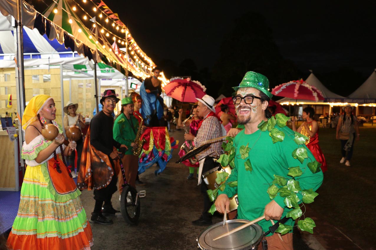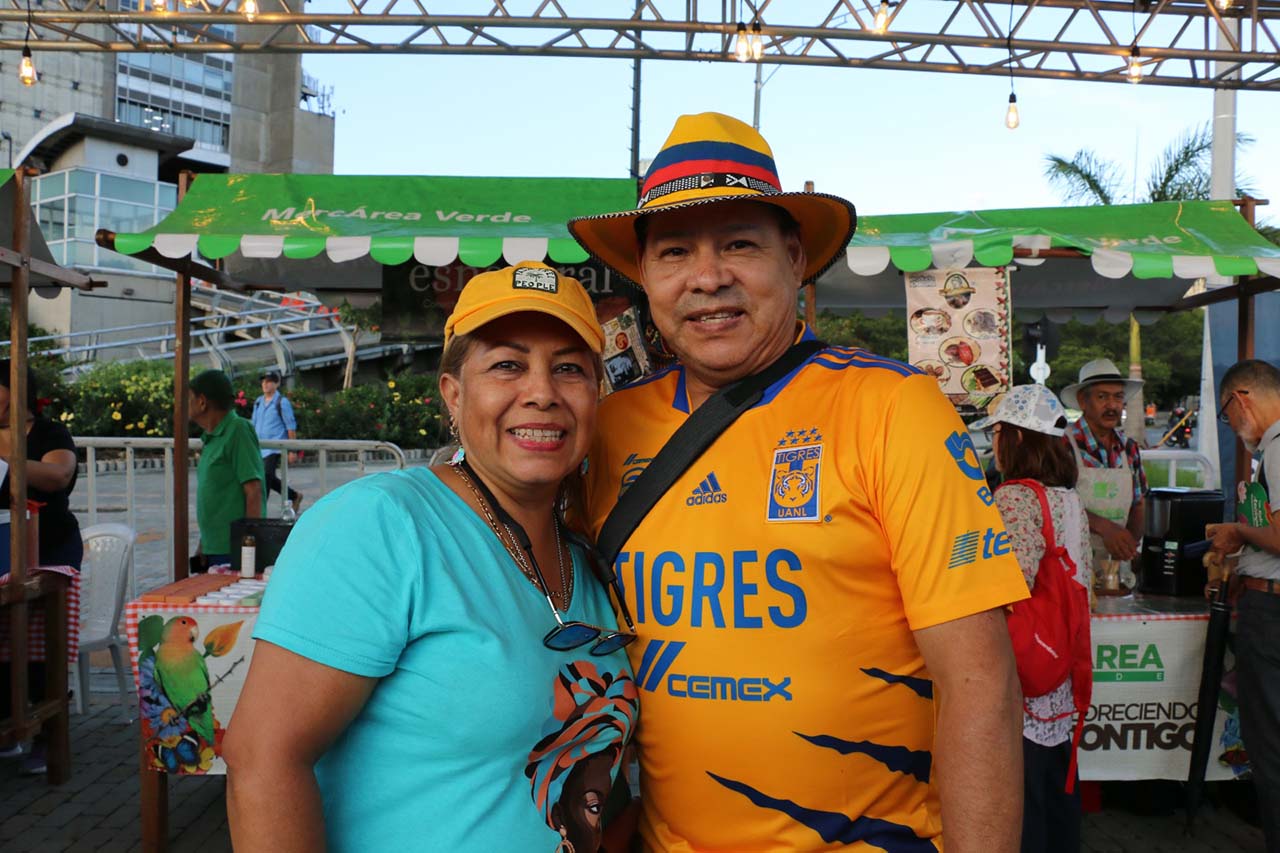 Diferentes idiomas se escuchan al pasar por los diversos ambientes de las plazas. Personalidades de todos los tamaños y colores que nos hacen sentir en una pequeña Babel, cosmopolita y vibrante, cargada de alegría y de sorpresas; personas con miradas intensas y chispas de alegría, como las que nos deja ver Mirna Rojas. Ella convenció a su amigo Héctor Marrugo para que vinieran desde Monterrey, México, a conocer a Medellin y disfrutar de la Feria de las Flores: “Les platiqué de venir a la Feria. Yo ya había venido antes, pero ahora quería conocer la ciudad en esta época y nos ha encantado; es muy limpia, con un acento muy bonito y nos ha gustado mucho la bandeja paisa”.