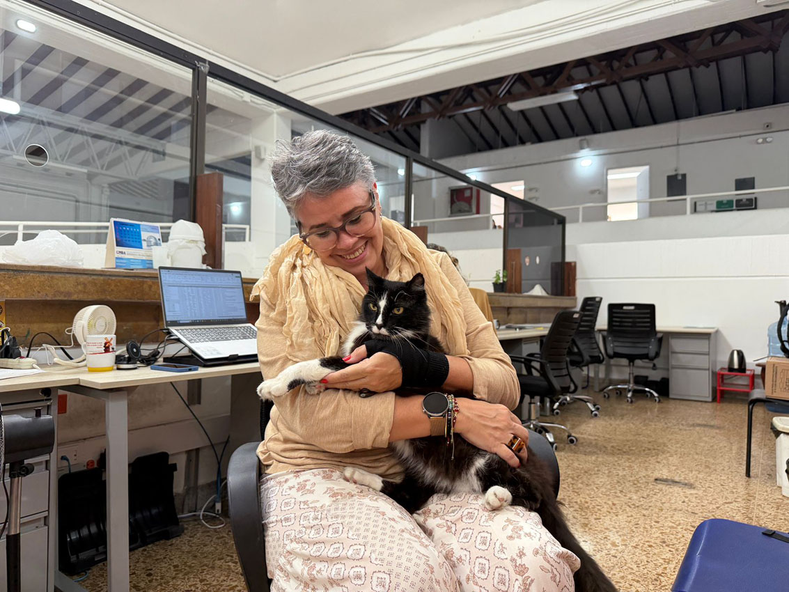“Cuando yo llegué a trabajar acá me dijeron: ‘acá hay un gato’. Y yo: ¿dónde? ¿Dónde está? Y cuando lo vi, me enamoré. Michín se convirtió en una pausa en medio del estrés. En un respiro. Tenerlo ahí, cuando la carga laboral es pesada, es como volver a ese espacio de autorregulación después de una llamada muy maluca. Es muy chévere”.