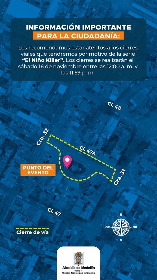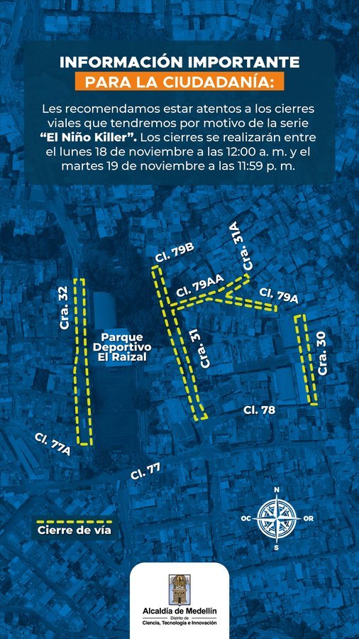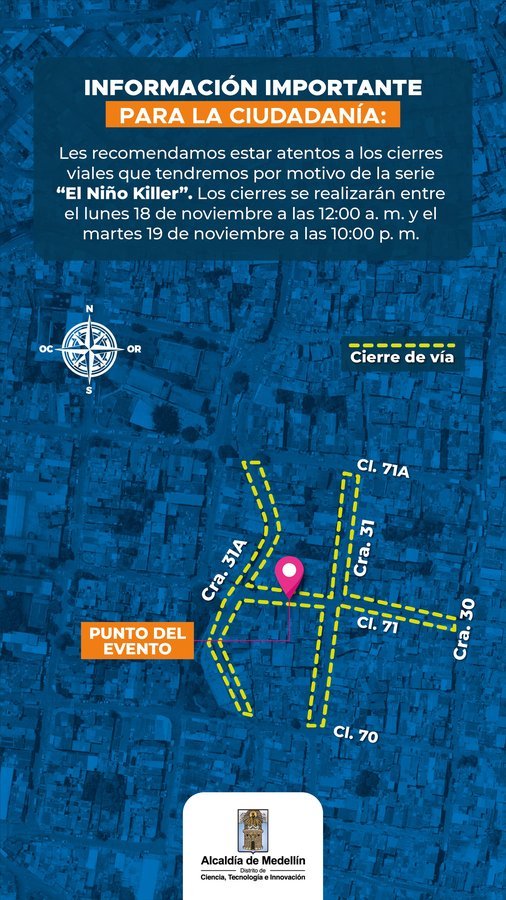 También, el domingo por el rodaje de El Niño Killer, desde las 12:00 a. m. y hasta el martes a las 10:00 p. m., habrá cierres escalonados en la carrera 31, entre las calles 70 y 71 A; en la calle 71, entre carreras 30 y 31 A; en la carrera 31 A, entre las calles 70 y 71 A; en la carrera 32, entre las calle 70 y la calle 69 con carrera 32, y entre las calles 71 y 71 A; también, en la carrera 32, entre las calles 70 y 71; y en la calle 71, entre las carreras 32 y 33.
