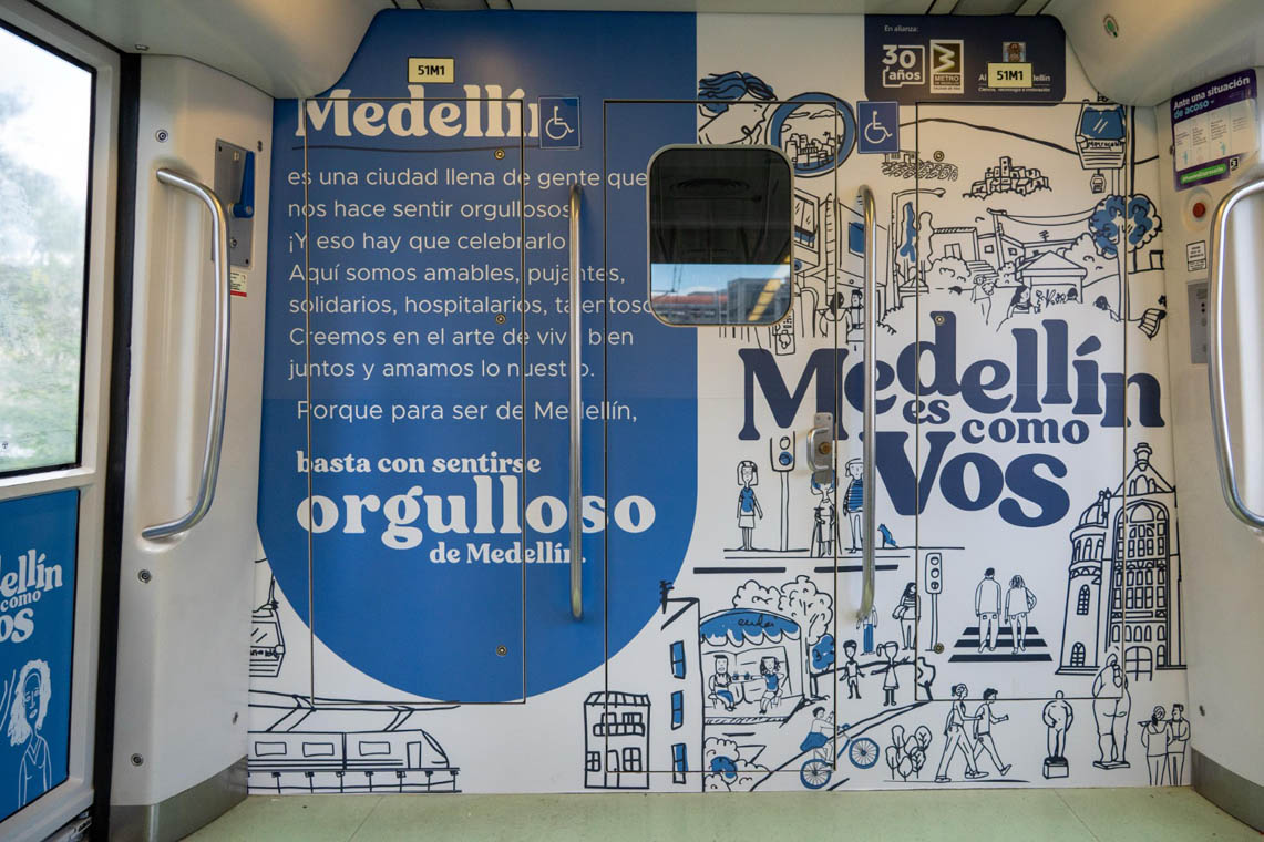 El vagón del Metro cuenta con frases como “Aquí viaja el orgullo de Medellín”, y “El orgullo de Medellín es su gente”, mensajes que convocan e involucran a las personas, acompañados de historias de ciudadanos reconocidos por sus comportamientos prosociales, y sillas marcadas con frases que evocan características como amabilidad, empuje, solidaridad, hospitalidad, talento y sentido de pertenencia.