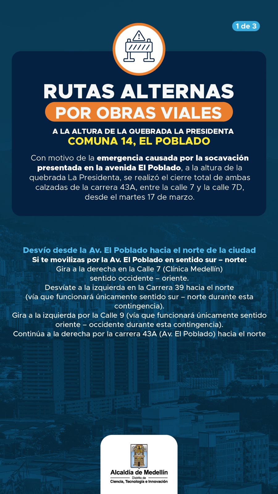 La Secretaría de Movilidad de Medellín informa a la ciudadanía que, debido a la caída de la calzada en la avenida El Poblado en sentido sur–norte, a la altura de la calle 7, y mientras se adelantan los estudios técnicos y las obras necesarias para estabilizar el terreno, se mantiene el cierre total de la avenida El Poblado entre la calle 7 y la calle 7D en ambos sentidos.