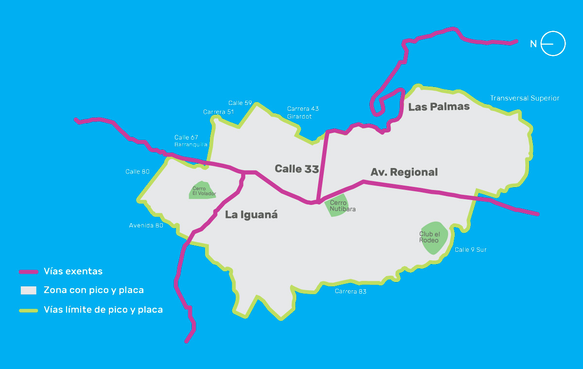 También, están exentas la calle 78 entre la avenida Regional y la carrera 64C (sentido oriente–occidente, calzada norte), la carrera 64C en sentido sur–norte (costado oriental) entre la calle 78 y la calle 88, y la calle 88 entre las carreras 64C y 64A.
