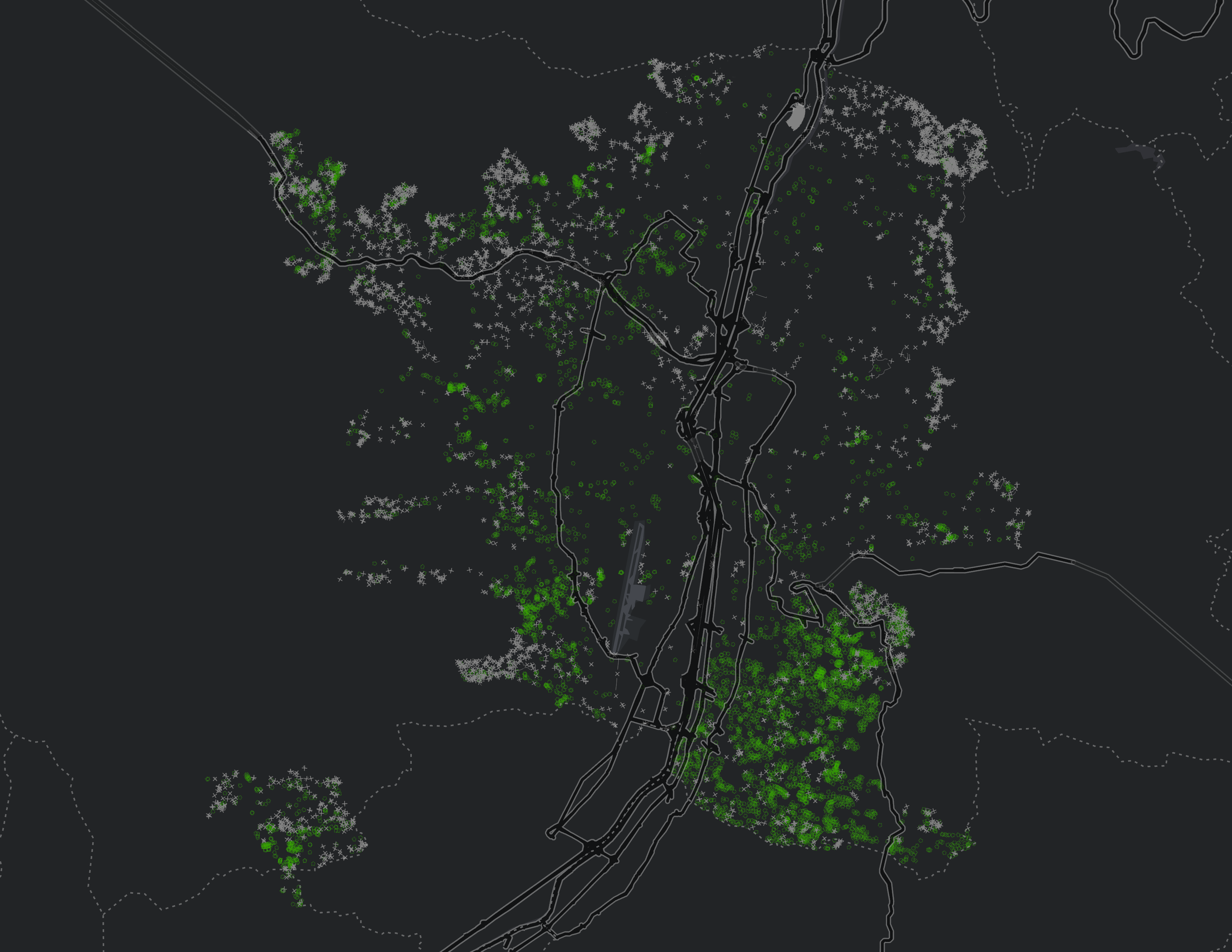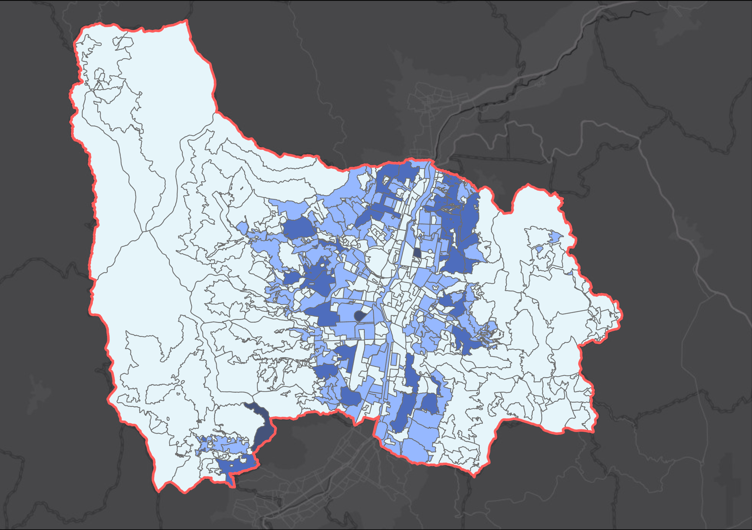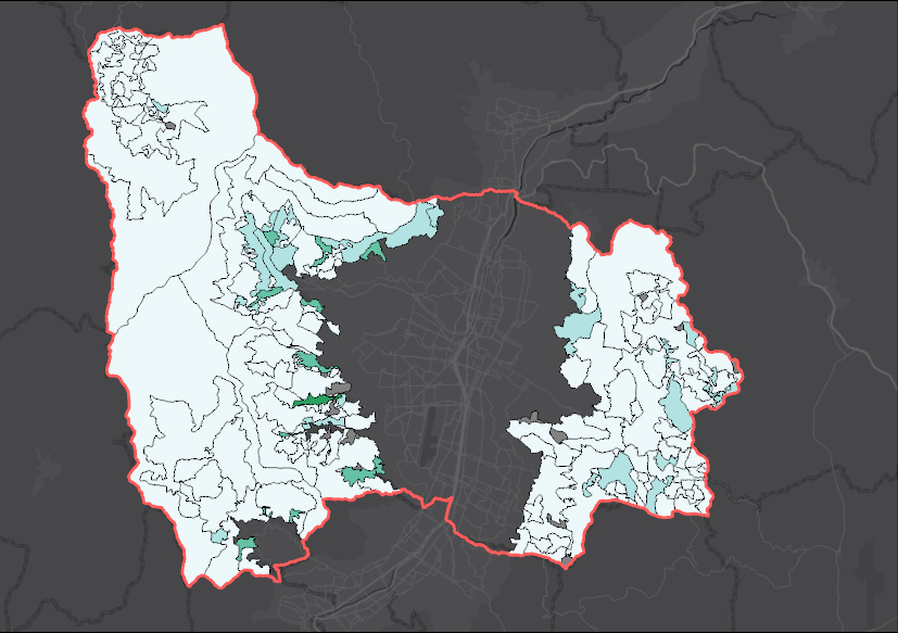 Capa vectorial de tipo polígono (hexágonos regulares) que representa la distribución espacial de los Puntos de Prestación de Servicios (PPS) en suelo rural, con unidades homogéneas de 10.000 m² (1 hectárea). Cada hexágono contiene la cantidad total de PPS identificados en su área. Los PPS corresponden a registros suministrados por Empresas Públicas de Medellín (EPM), los cuales evidencian la existencia de al menos una conexión de servicio público activa asociada a un cliente residencial. Esta aproximación evita distorsiones derivadas de tamaños variables de lotes rurales y permite identificar patrones de ocupación sectorizada.