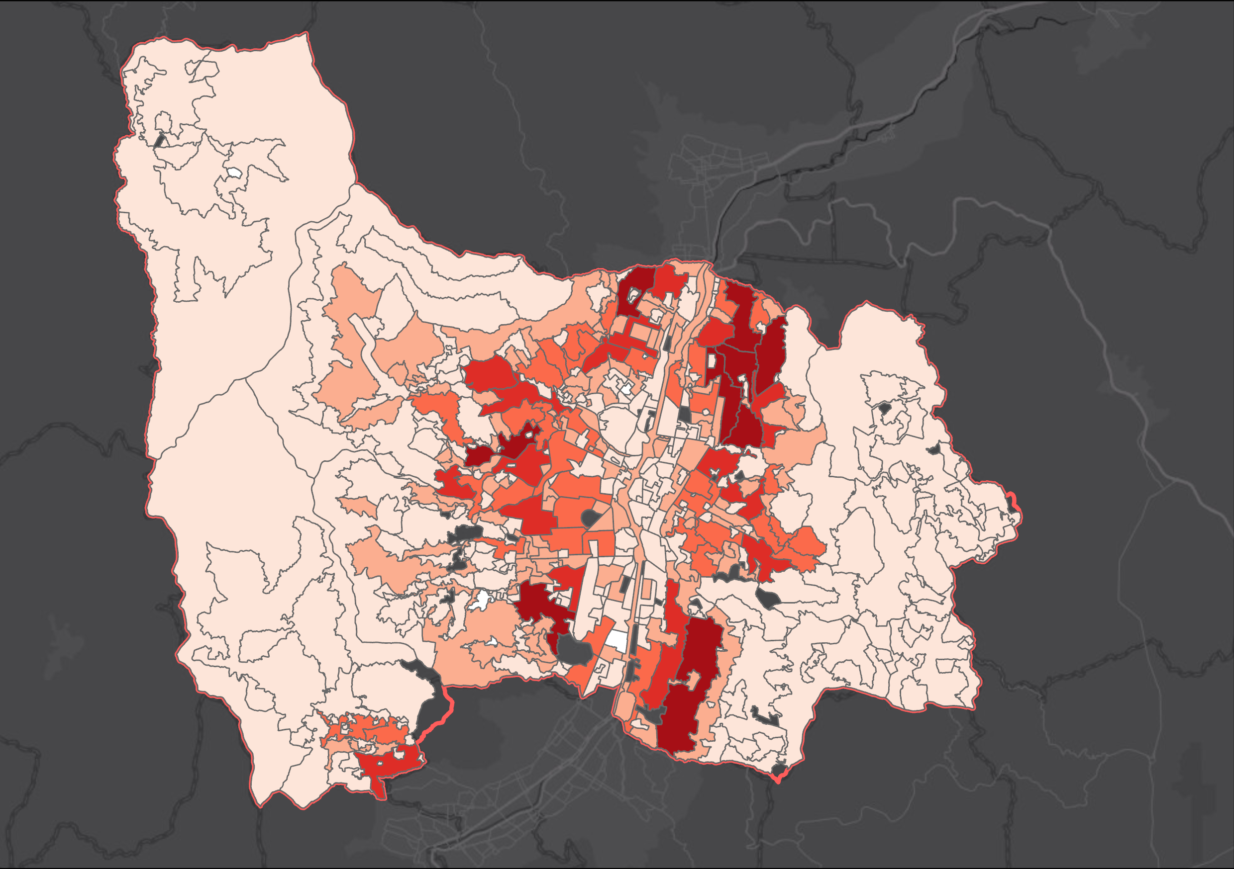 Capa tipo polígono contiene los polígonos clasificados según los diferentes tipos de áreas de interés: alto riesgo mitigable, alto riesgo no mitigable, barrios, comunas, zonas con condiciones de riesgo, riesgo bajo, riesgo medio y tratamientos urbanísticos. Además, incluye el total de los Puntos de Prestación de Servicio (PPS) presentes en cada polígono, de acuerdo con el año de vigencia. Los PPS son registros proporcionados por Empresas Públicas de Medellín (EPM) que representan la conexión de al menos un servicio público a un cliente residencial. El Departamento Administrativo de Planeación se encarga de recopilar, procesar e integrar esta información en una plataforma de visualización interactiva, facilitando su consulta y análisis. Esta herramienta permite explorar y comparar datos a diferentes niveles de desagregación territorial, como comunas, barrios, veredas y polígonos de tratamiento. De esta manera, apoya la toma de decisiones urbanísticas, el seguimiento del crecimiento urbano y la planificación territorial basada en evidencia. El valor reportado refleja el número total de PPS en cada polígono.
