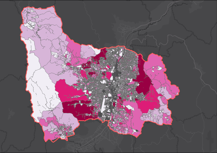 Capa tipo polígono que representa el total de Puntos de Prestación de Servicios (PPS) por manzana. Cada polígono corresponde al contorno de una manzana catastral, definida como un área de terreno delimitada por vías vehiculares o peatonales, y/o por accidentes geográficos naturales como cerros, acequias o ríos. Las manzanas están georreferenciadas para su identificación catastral y codificadas mediante el sistema COBAMA, que consta de siete dígitos: dos para el código de la comuna, dos para el barrio y tres para la manzana. Los PPS son registros suministrados por Empresas Públicas de Medellín (EPM), que evidencian la existencia de al menos una conexión de servicio público asociada a un cliente de tipo residencial. El Departamento Administrativo de Planeación se encarga de recopilar, procesar e integrar esta información en una plataforma de visualización interactiva, facilitando así su consulta y el análisis territorial.