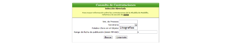 - En Servicios, debes seleccionar la modalidad que deseas consultar, aparecerá una ventana como la que te mostramos a continuación, en donde en el espacio "Palabra clave en el Objeto" puedes utilizar palabras precisas relacionadas con el aspecto que desees buscar, por ejemplo si tu objeto es construcción de vías resume tu búsqueda a palabras claves como construcción o vías esto reducirá tu tiempo de búsqueda. En el ejemplo que estamos desarrollando en este módulo podrías buscar litografías.
