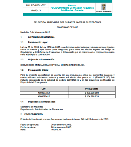 Un vez se cumpla el plazo establecido en el Pliego de Condiciones, debes consultar el Informe de Verificación de los requisitos habilitantes en cualquiera de las páginas web del Municipio de Medellín o el Portal Único de Contratación tal como lo viste en el módulo de Medios: www.medellin.gov.co y www.colombiacompra.gov.co .