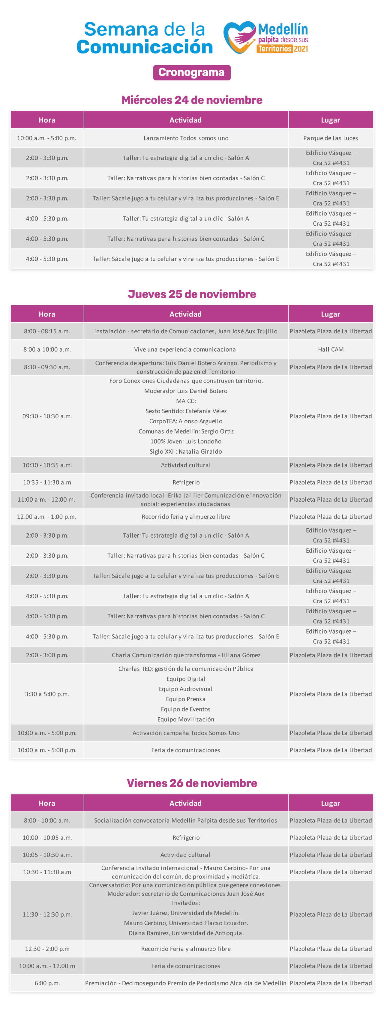 La Alcaldía de Medellín dando cumplimiento a la Política Pública de Procesos y Medios de Comunicación Alternativos, Independientes, Comunitarios y Ciudadanos -MAICC- reglamentada por el Decreto 2124 de 2019 y con el objetivo de promover y fortalecer la comunicación ciudadana de forma equitativa, la participación y cultura ciudadana; y la divulgación democrática de opiniones, presenta la primera versión de la Semana de la comunicación Medellín Palpita desde sus Territorios compuesta por la Feria de la Comunicación, el Decimoprimer Encuentro académico y el Decimosegundo Premio de Periodismo.