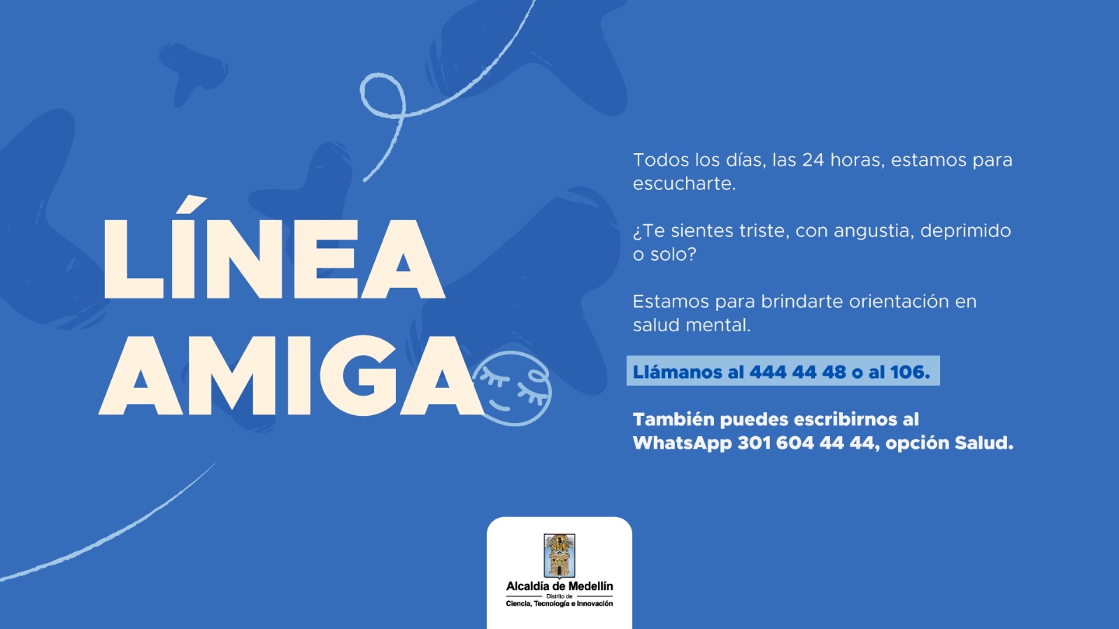 ¿Quienes somos? La Línea Amiga surgió como una estrategia integral diseñada por la Alcaldía de Medellín, a través de la Secretaría de Salud, mediante la cual se ofrece orientación psicológica gratuita las 24 horas, los 7 días de la semana, para todos los habitantes del Distrito. Los ciudadanos pueden acceder a este servicio llamando al 604 444 44 48 o escribiendo al WhatsApp de FLOR 3016044444, seleccionando la opción "Salud".